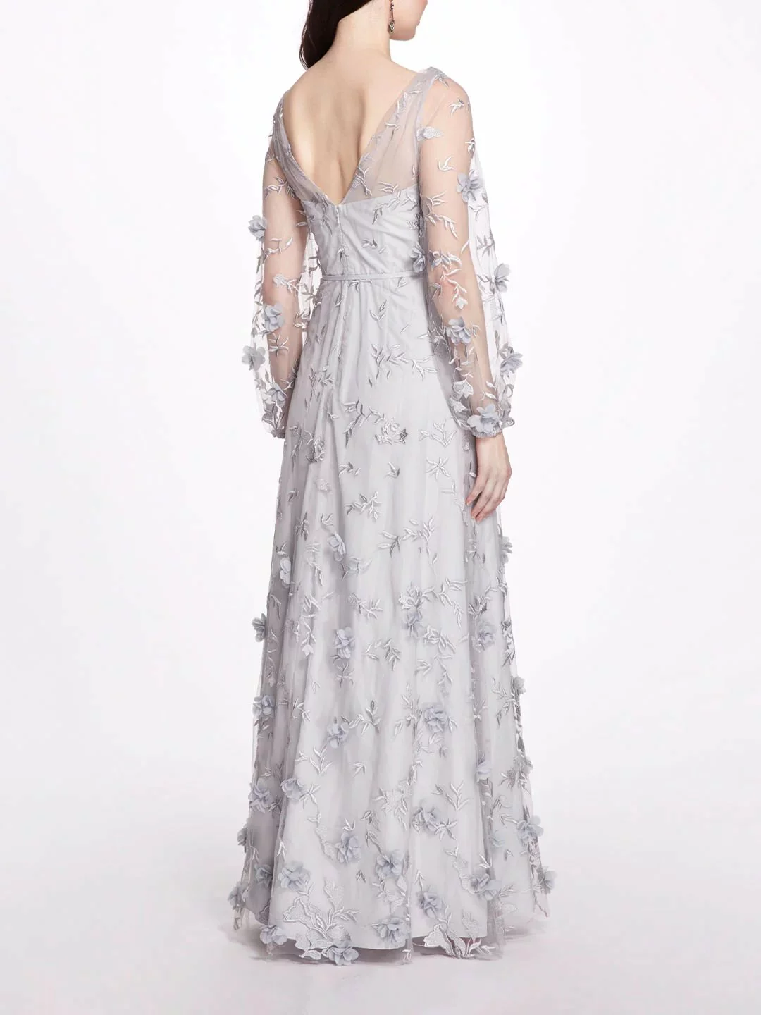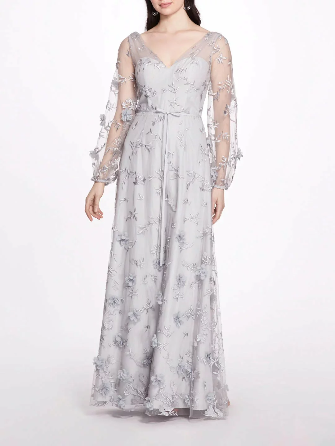 The Avellino gown in dove grey is a romantic option for any occasion. Featuring a graceful illusion long sleeve, amorous 3D flower appliqués, and a stunning ribbon at the waist.