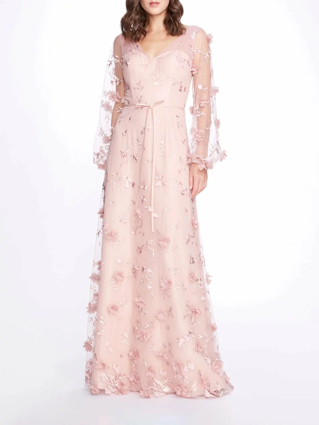 The Avellino gown is a romantic option for any occasion. Featuring a graceful illusion long sleeve, amorous 3d flower appliques and a stunning ribbon at the waist.