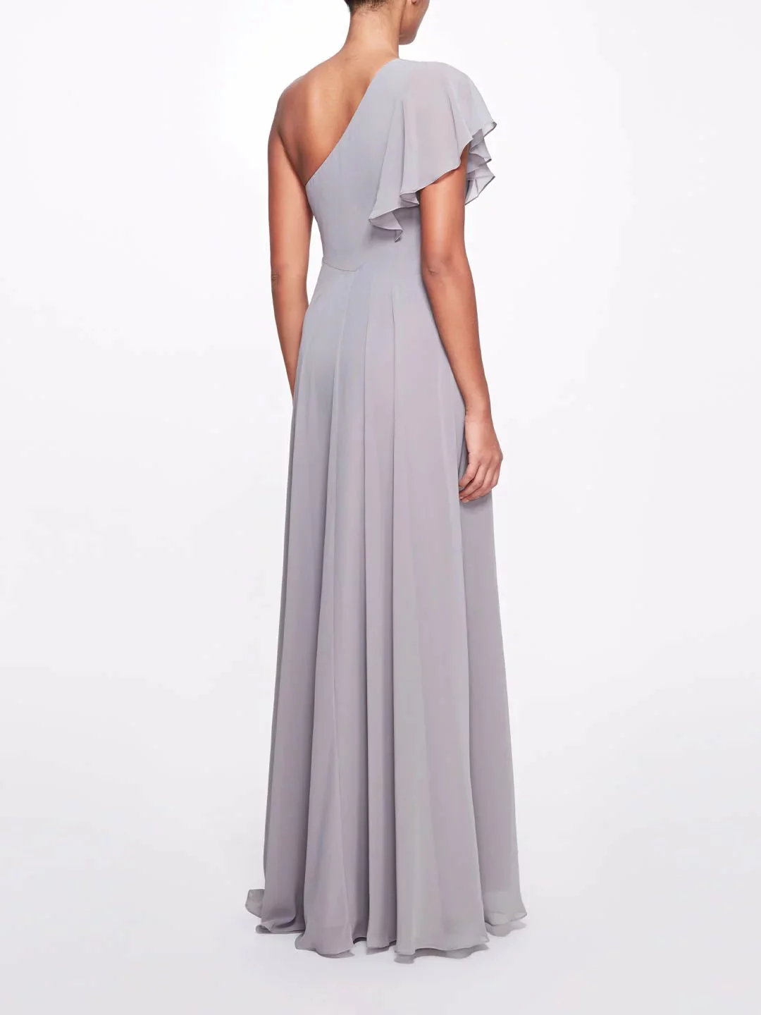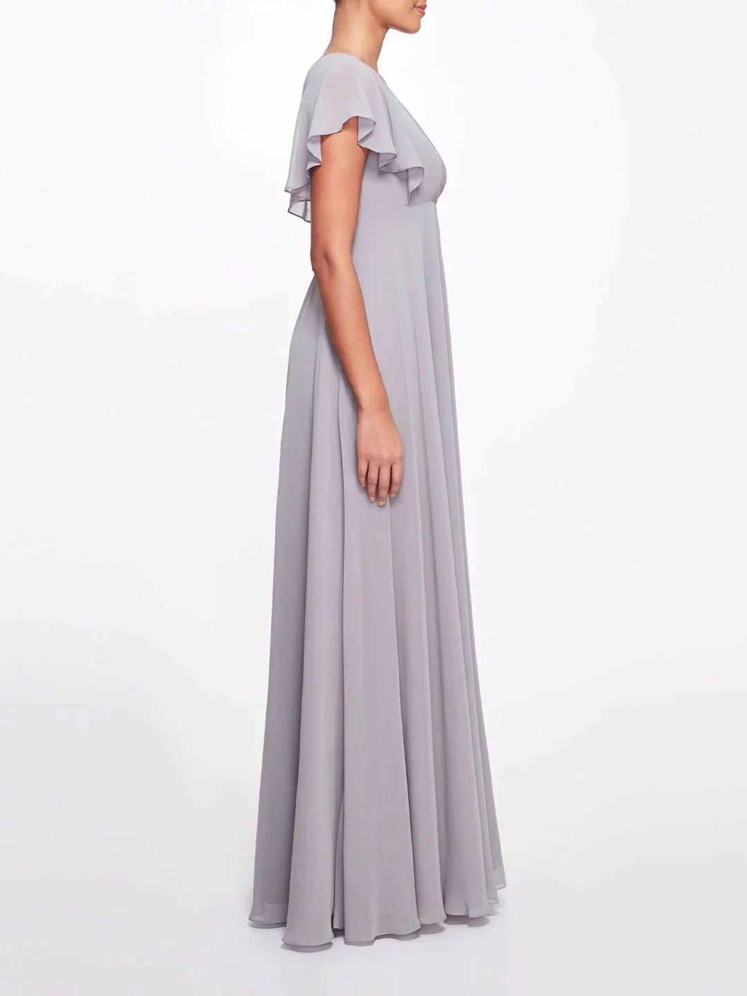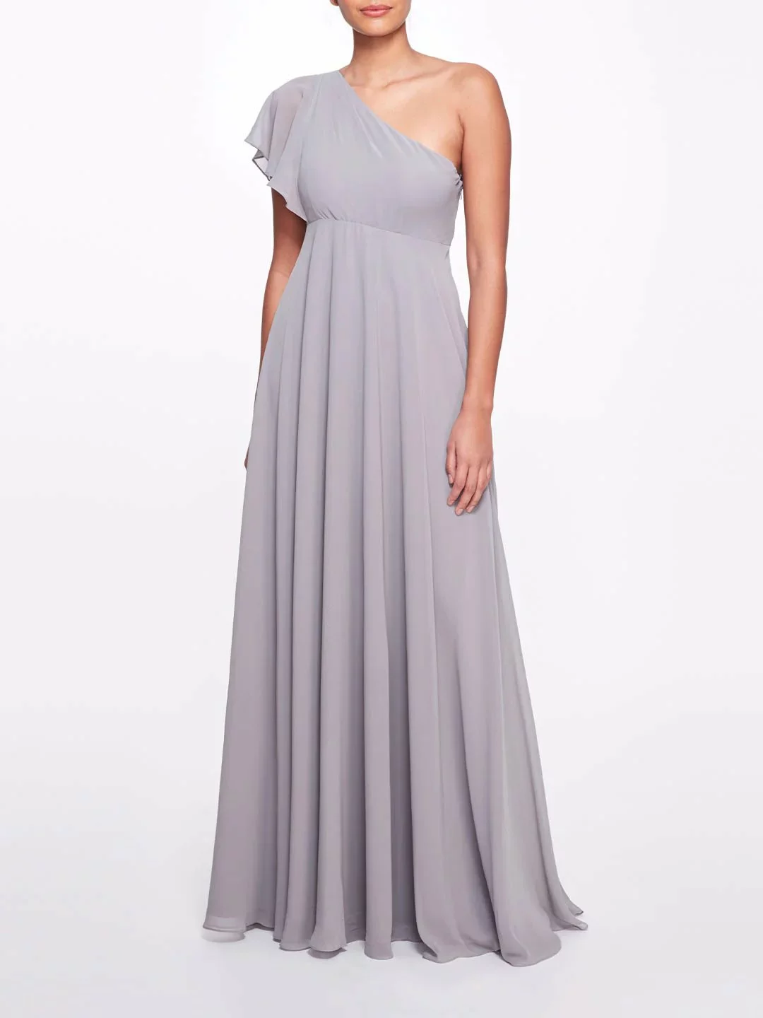 The Cremona gown features an empire waist gown with a one-shoulder design, alongside a flutter sleeve.