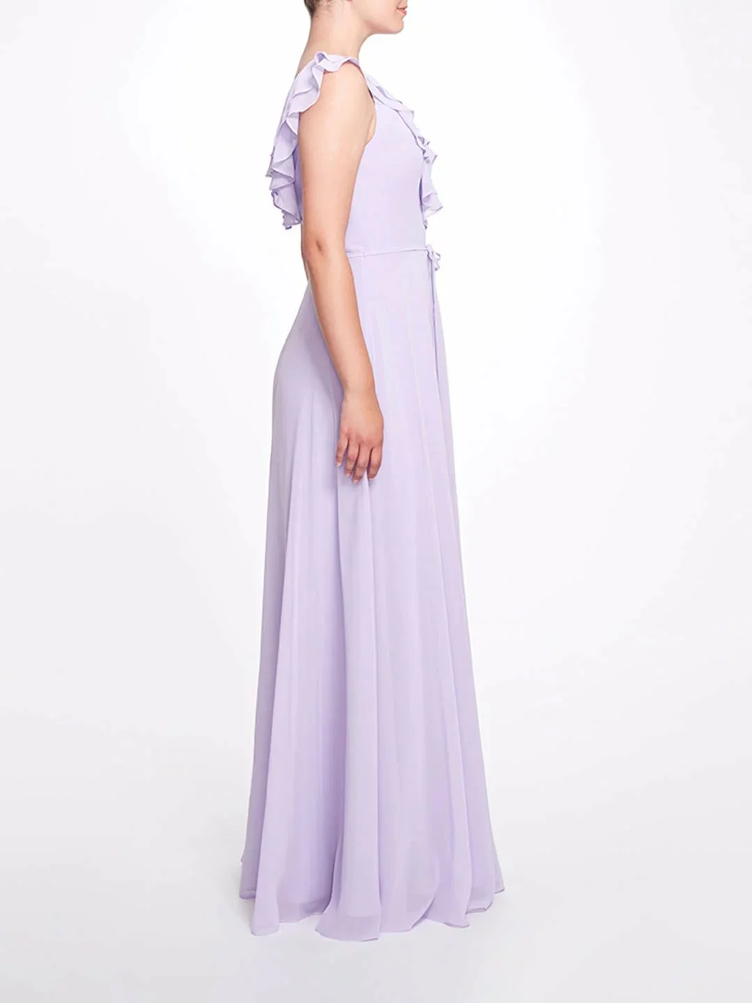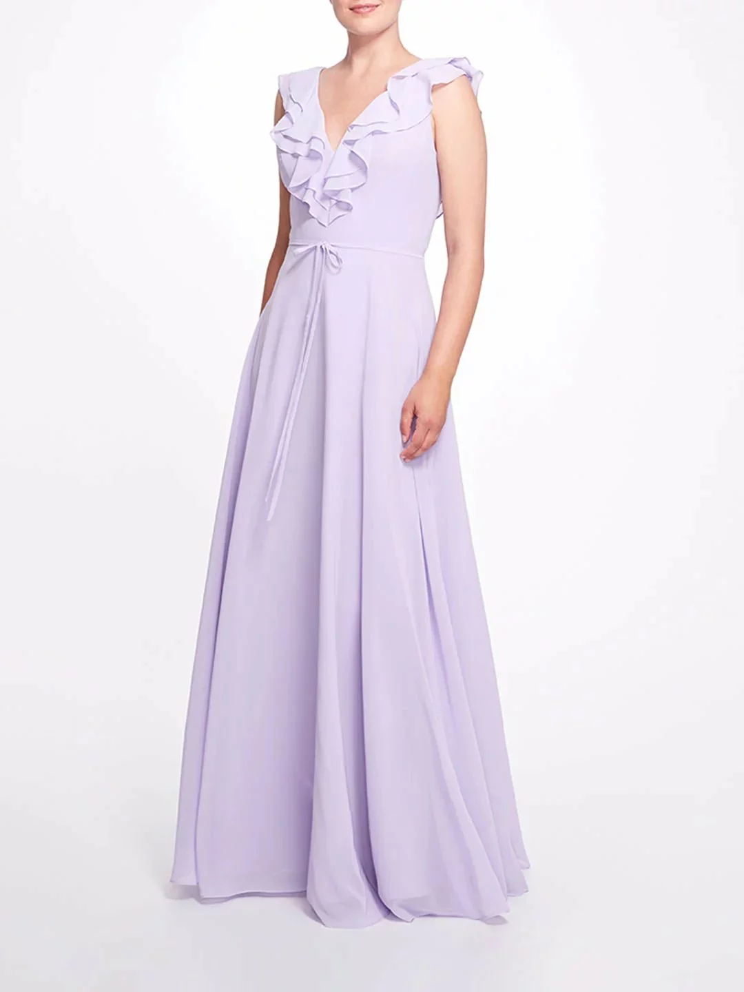 The Desio gown is enchanting for any occasion. Featuring printed chiffon, a flirtatious sleeveless design, a charming ruffle detailing and cinched waist tie.