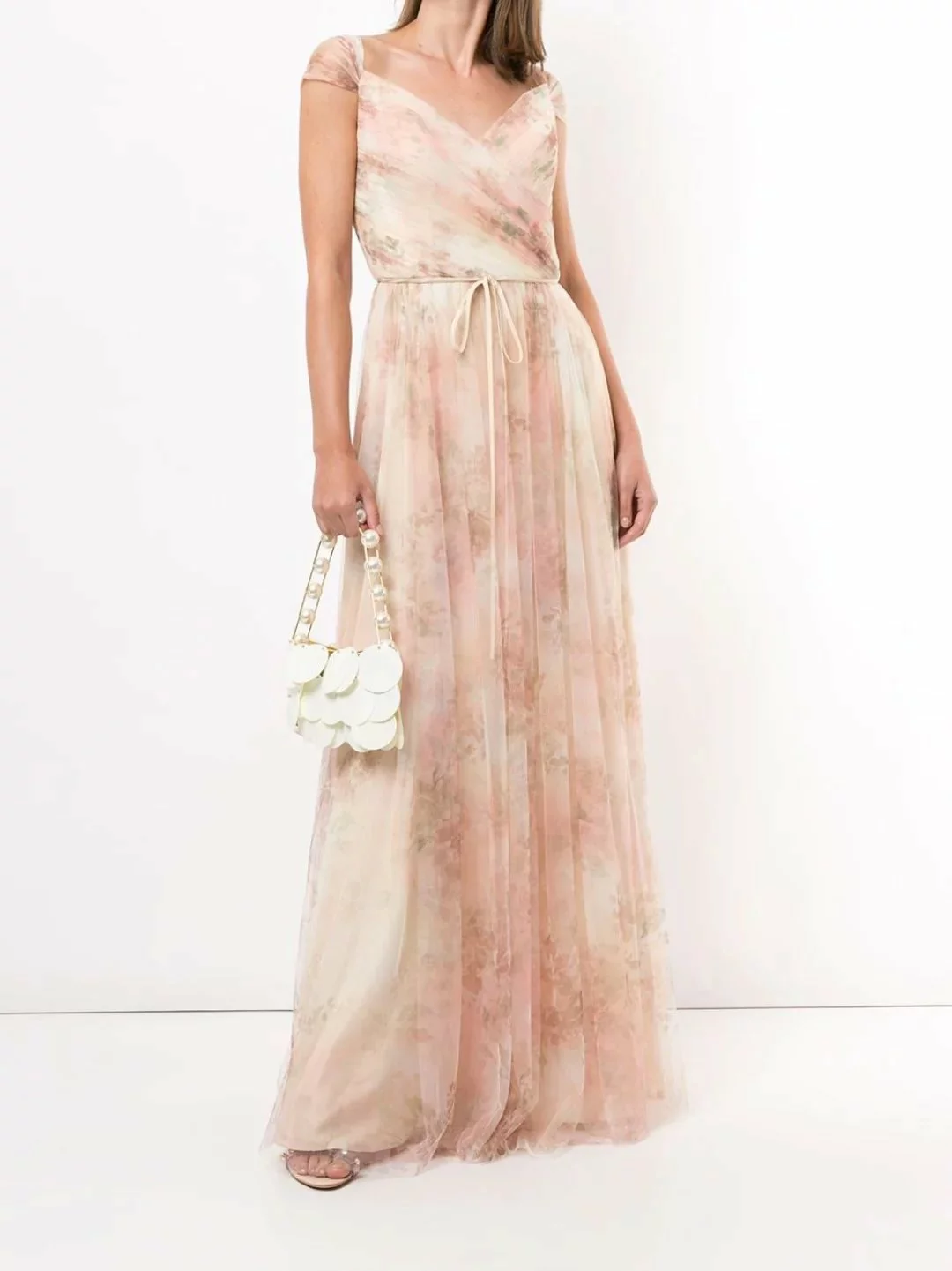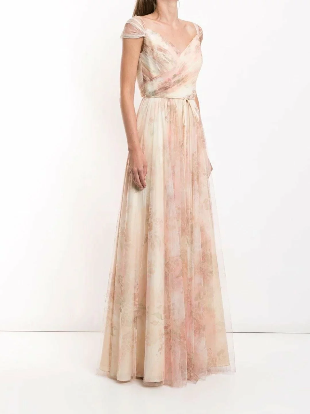Exude elegance in the Florence Printed gown. Featuring a whismiscal multi-optional sleeve and a charming bow at the waist.