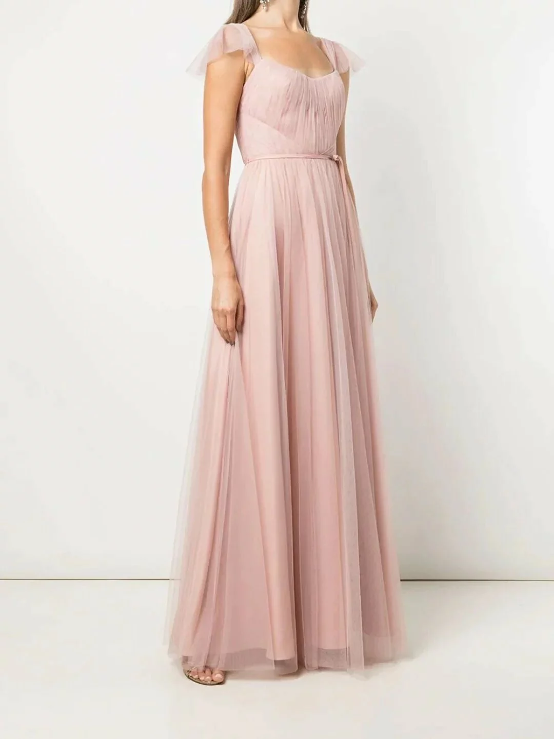 The Frascati full length blush pink tulle gown features a ruched u-neck and romantic sheer ruffle sleeves.
