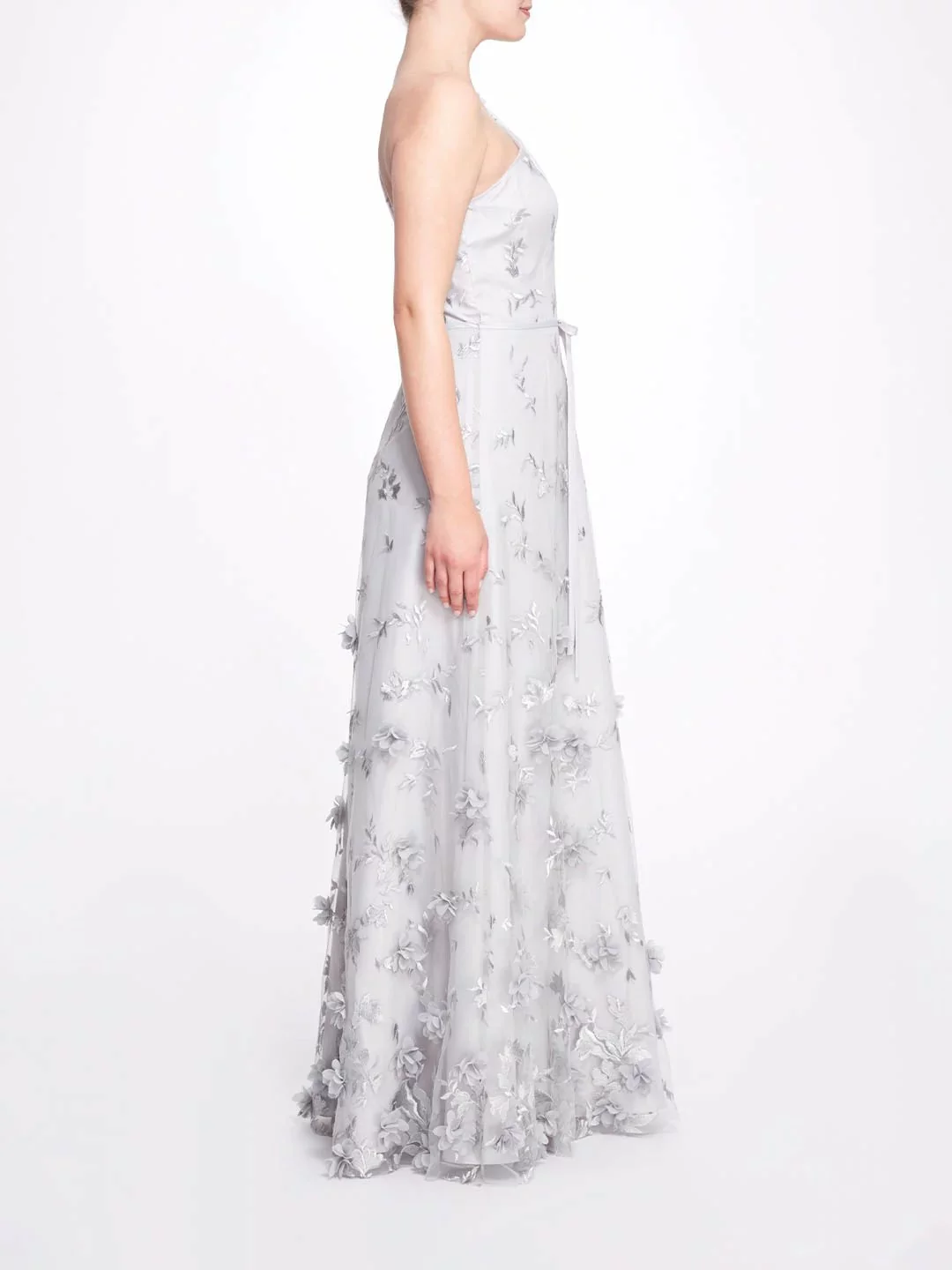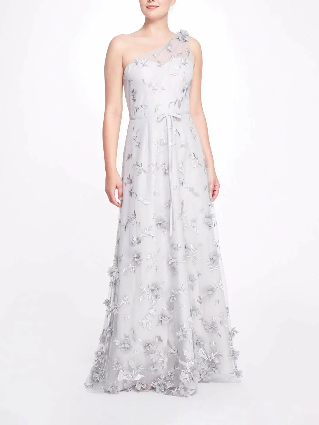 The Bari gown in dove grey features a sweetheart neckline with a tulle one-shoulder overlay, a dainty tie waist, and sprawling 3D floral appliqués.