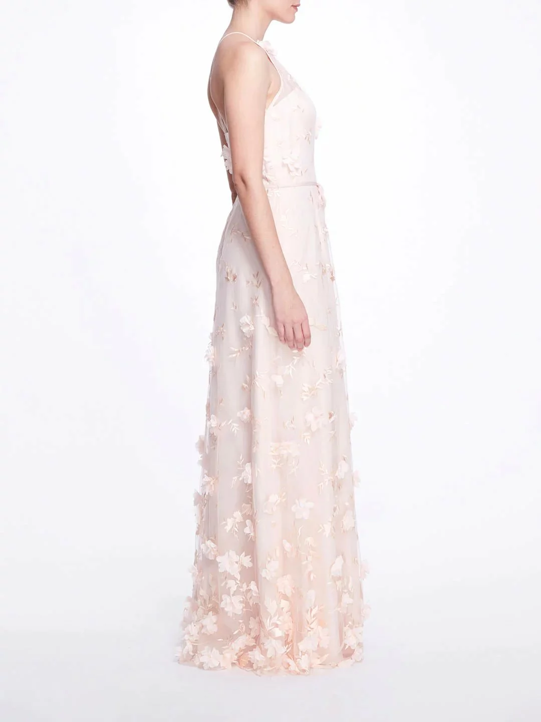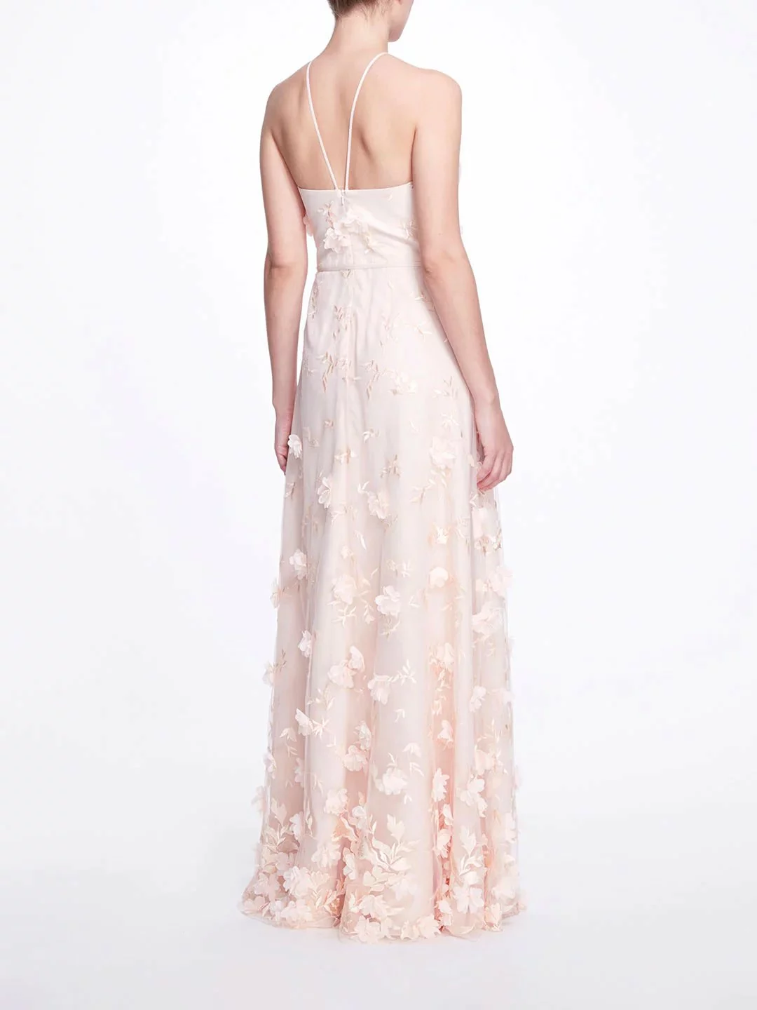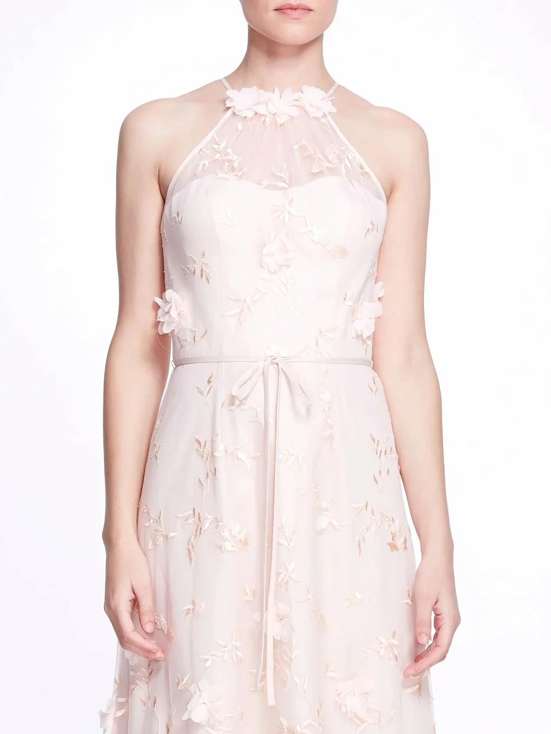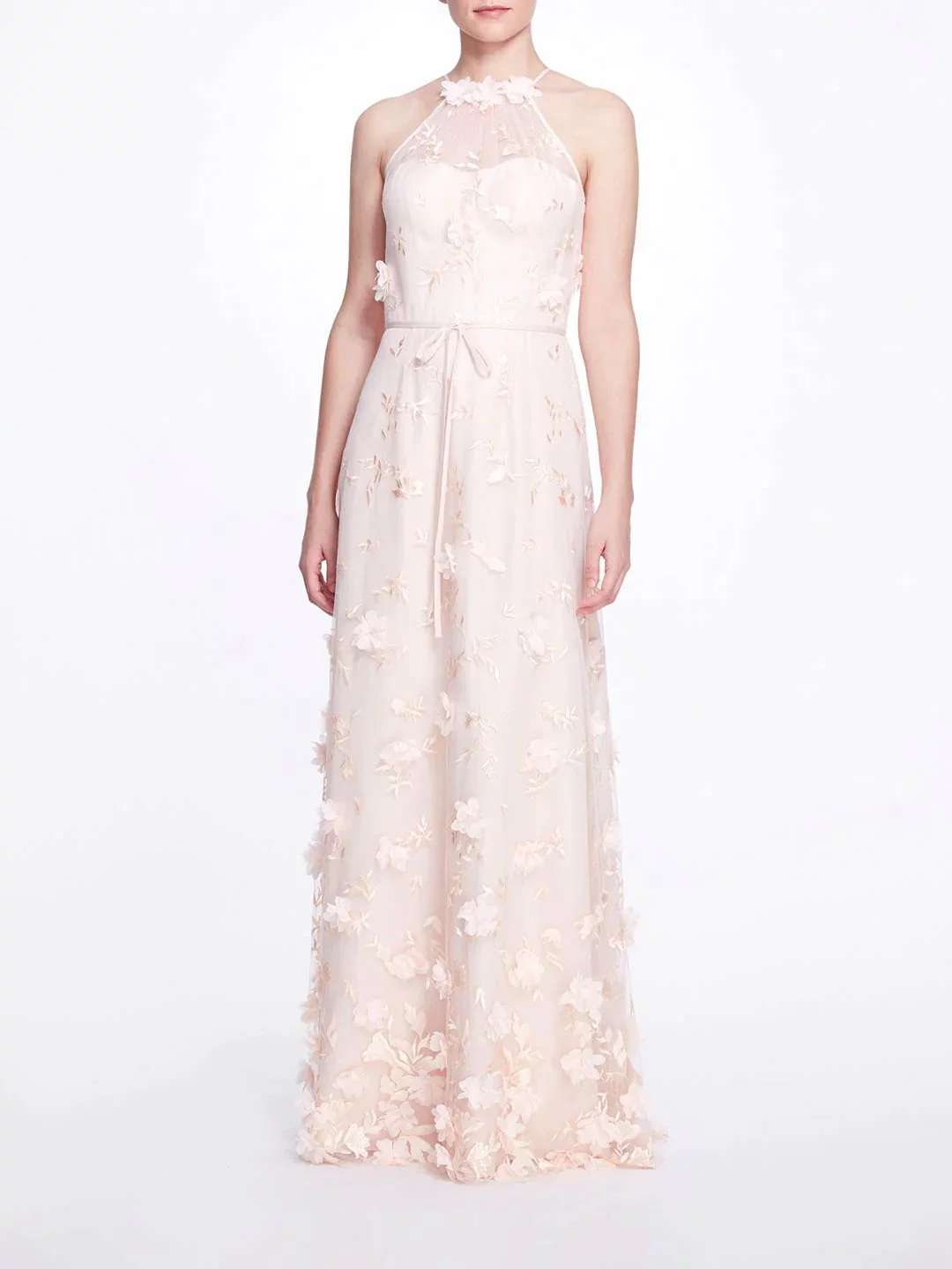 Become the epitome of feminity in the Jacquelene gown. Featuring fairy-tale 3D floral appliques, an exquisite halter neck with dainty straps, and a delicate tie waist with a delicate bow.