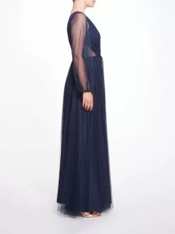 The Naples gown features a watercolor printed chiffon, cami straps with a ruffled multi-wear sleeve, and a dainty waist tie.