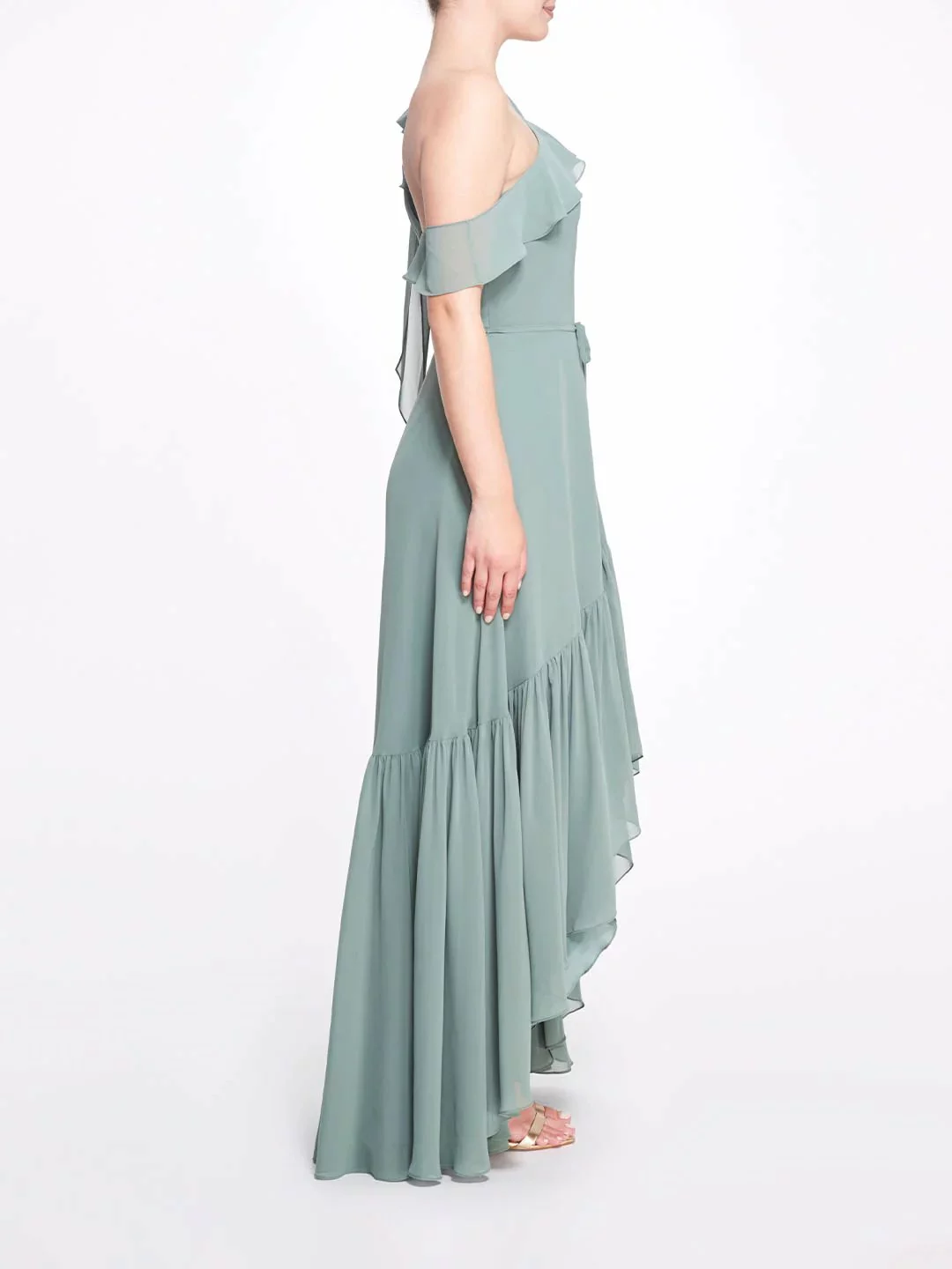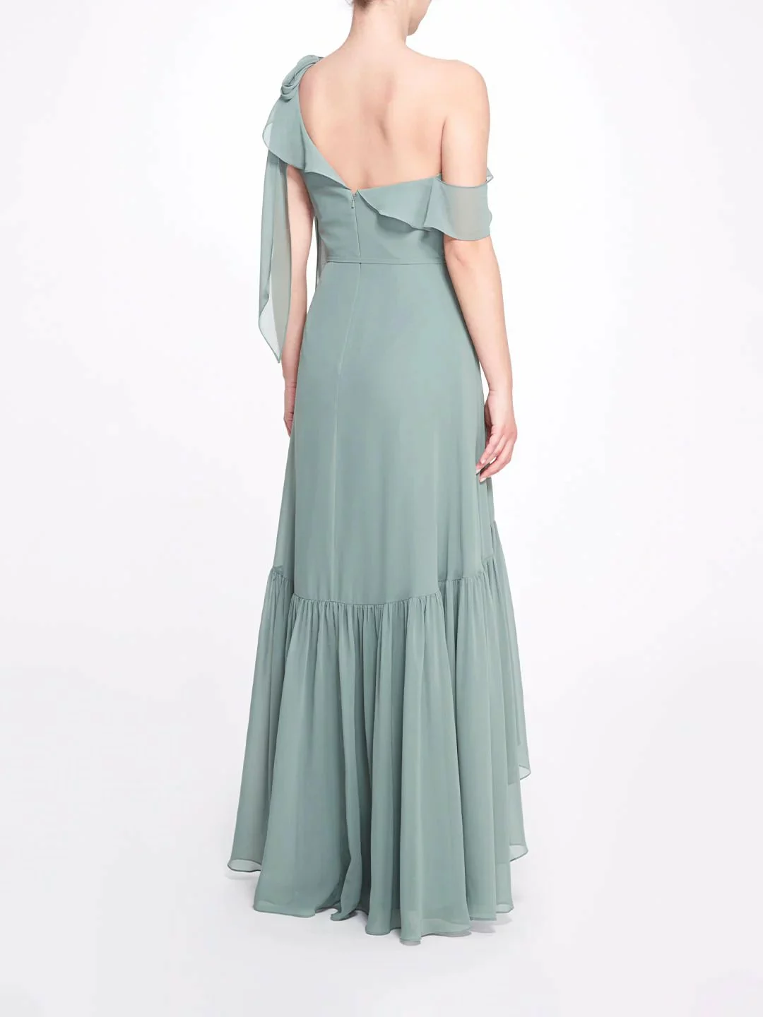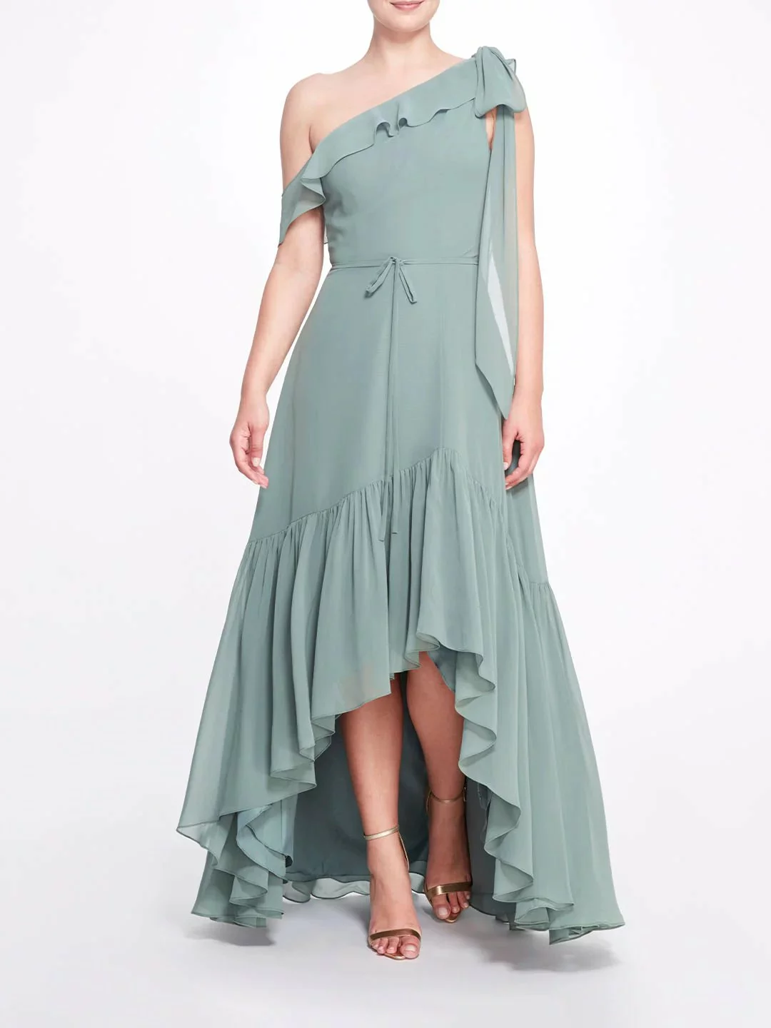 The Padua gown features a flirty one-shoulder neckline with ruffle trim and a cascading bow atop the shoulder, long bodice, hi-lo skirt, and dainty tie waist.