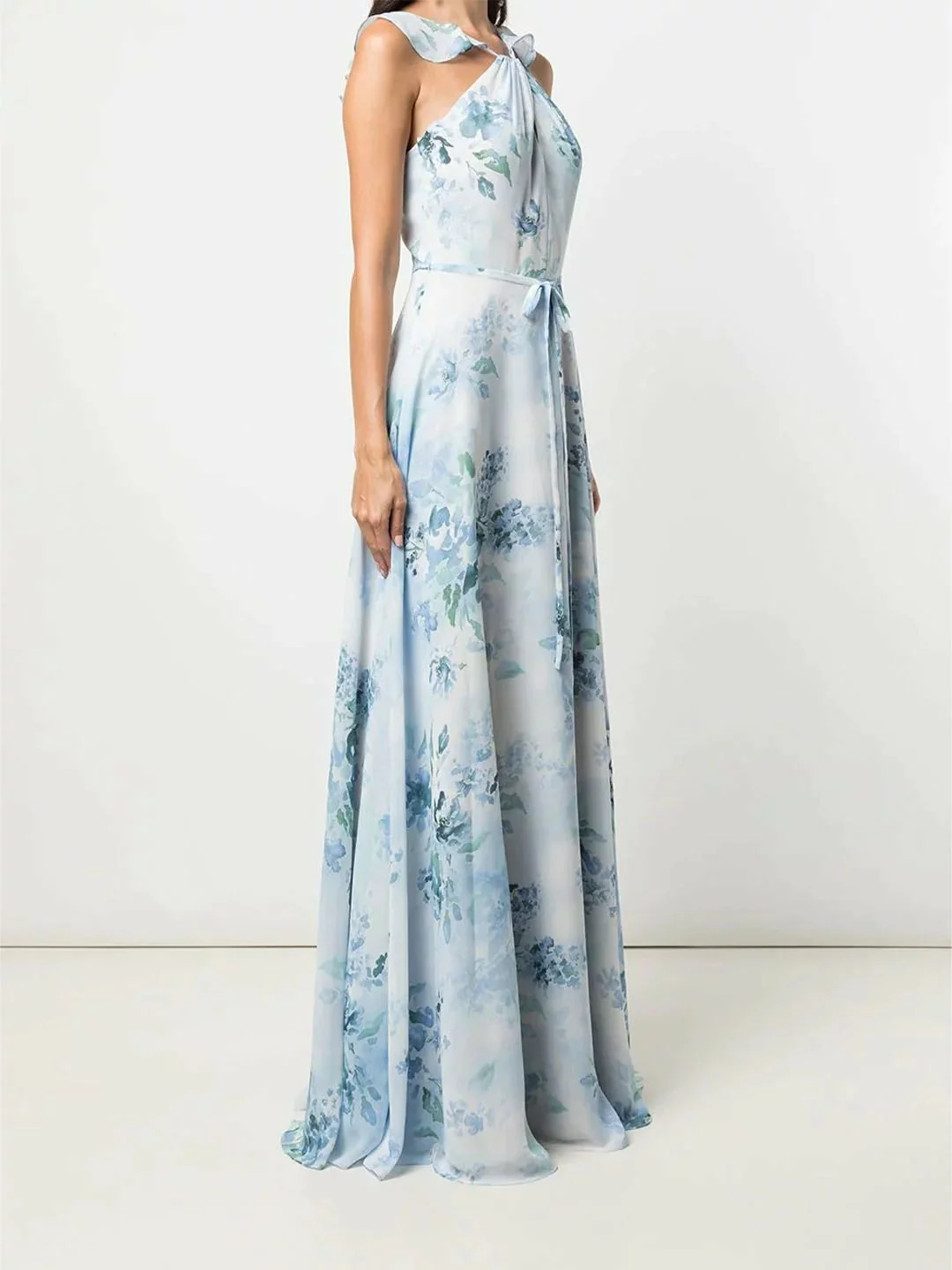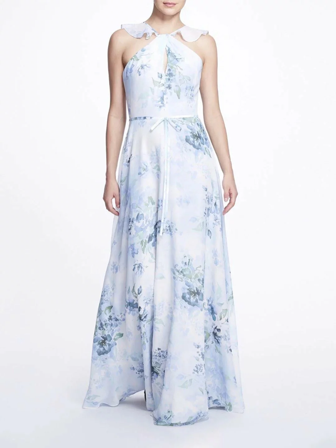 Step out in the effortless Pavia Printed gown. Featuring delicate printed chiffon, a charming halter neck with a ruffle detail, a subtle keyhole neckline, and a dainty bow around the waist.