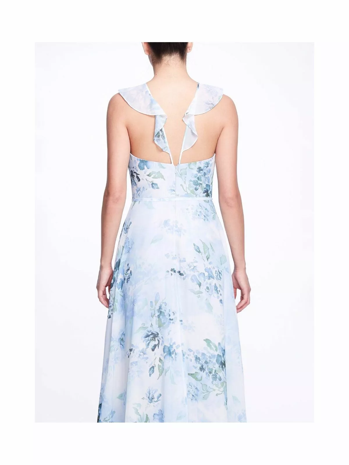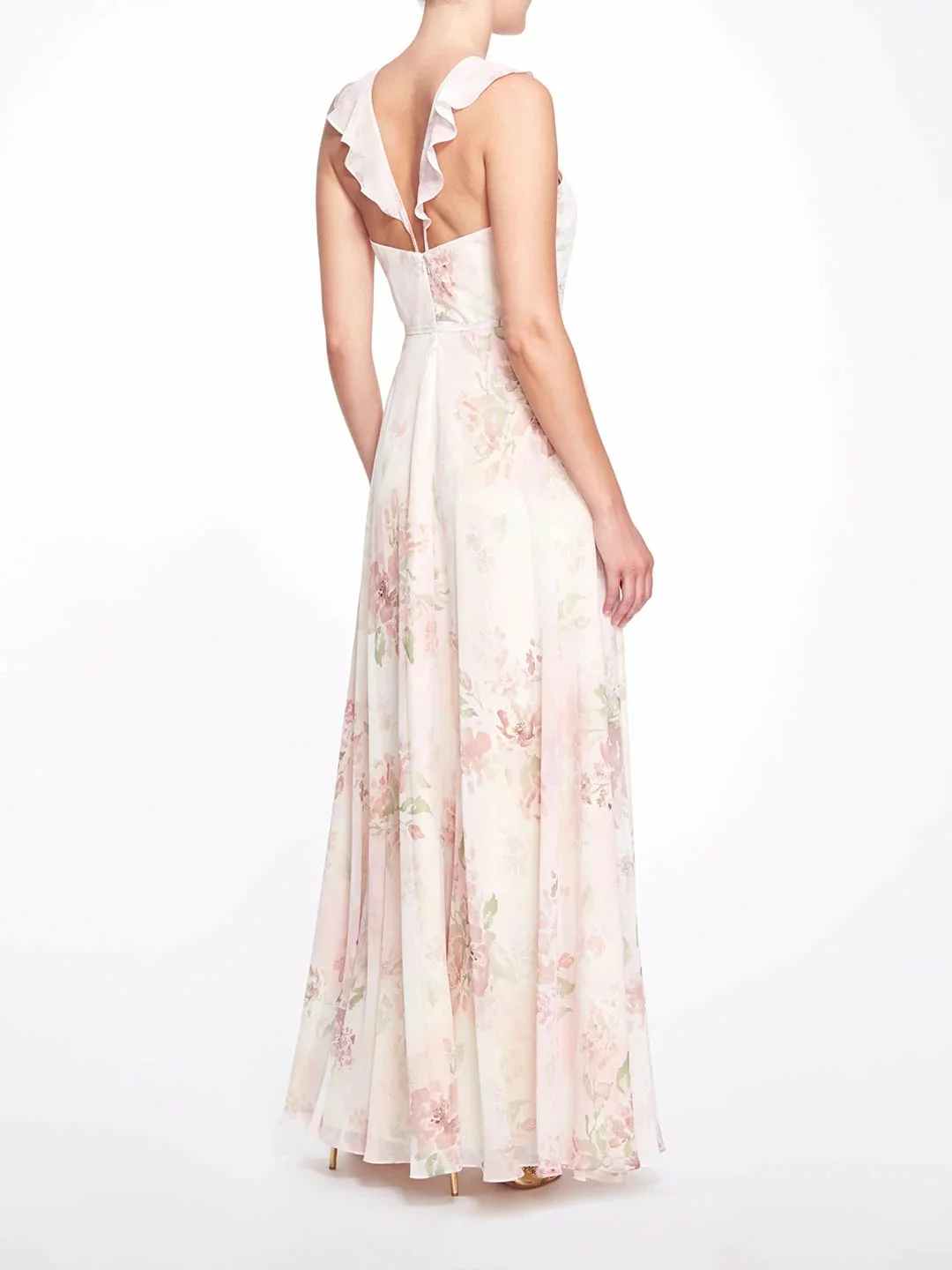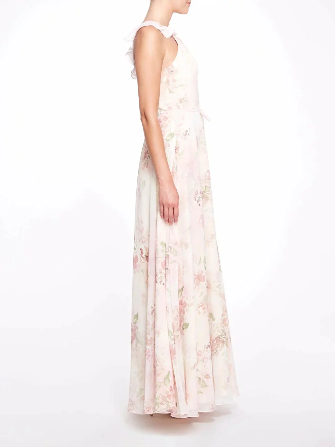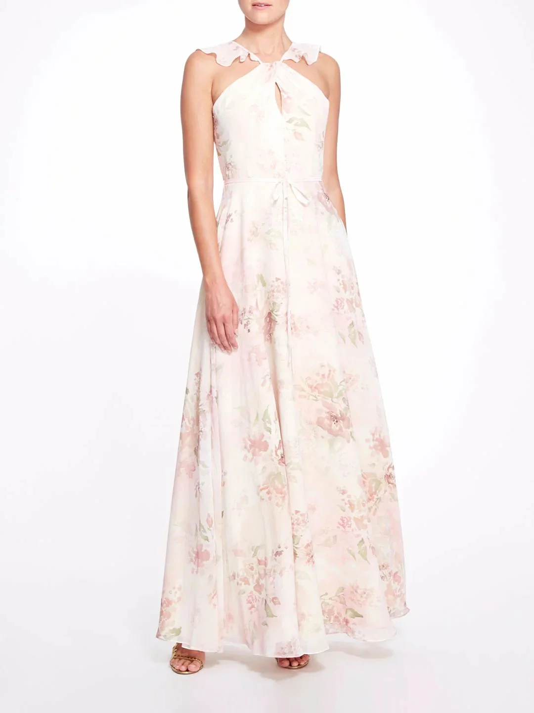 Step out in the effortless Pavia Printed gown. Featuring delicate printed chiffon, a charming halter neck with a ruffle detail, a subtle keyhole neckline, and a dainty bow around the waist.