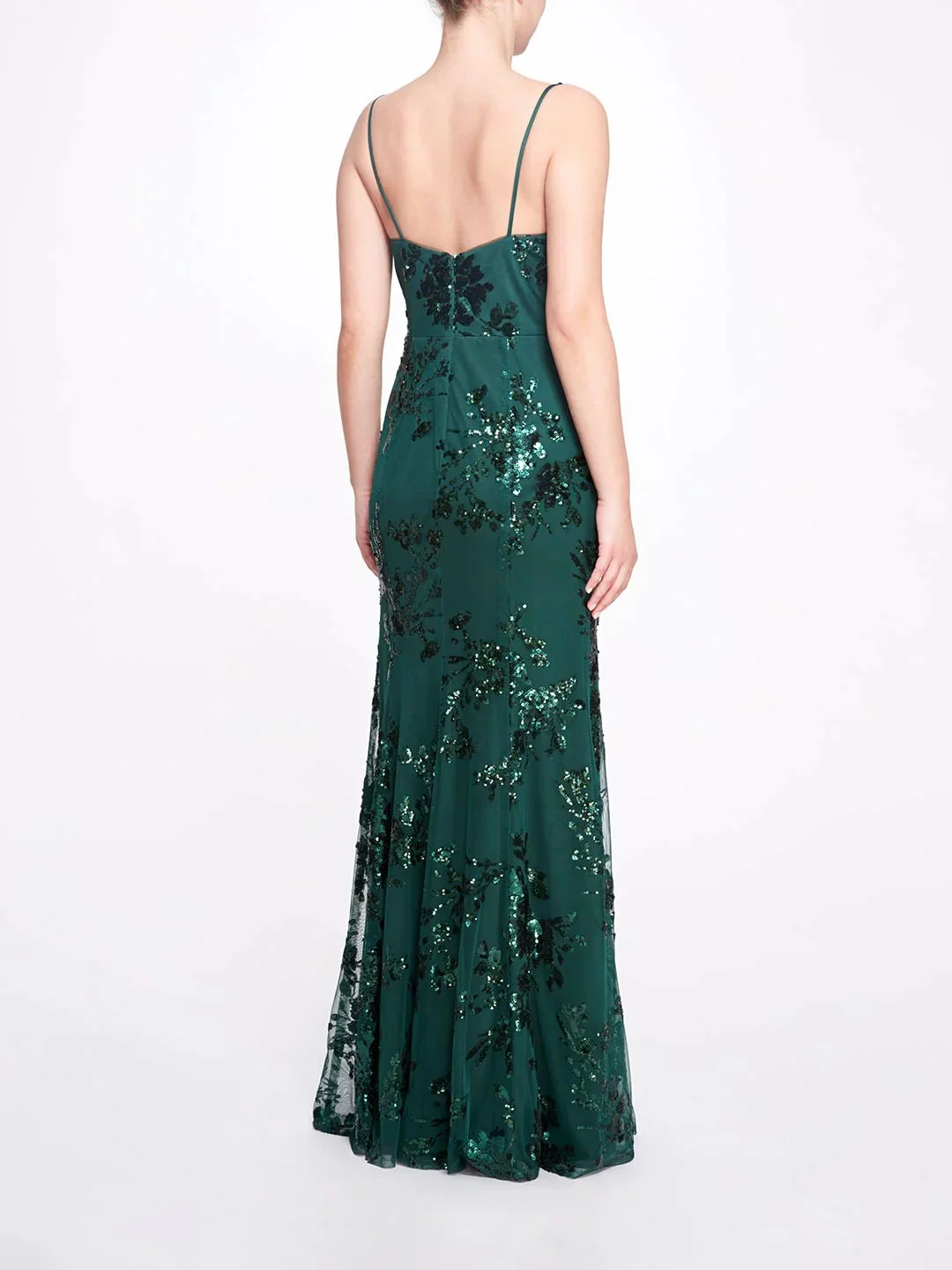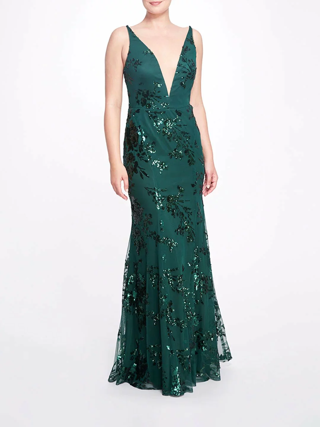 The Pisa gown features a romantic plunge v-neckline, fit and flare silhouette, and embroidered floral sequins.