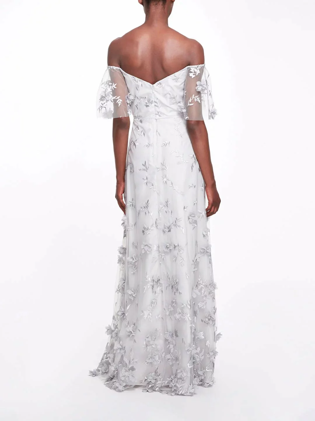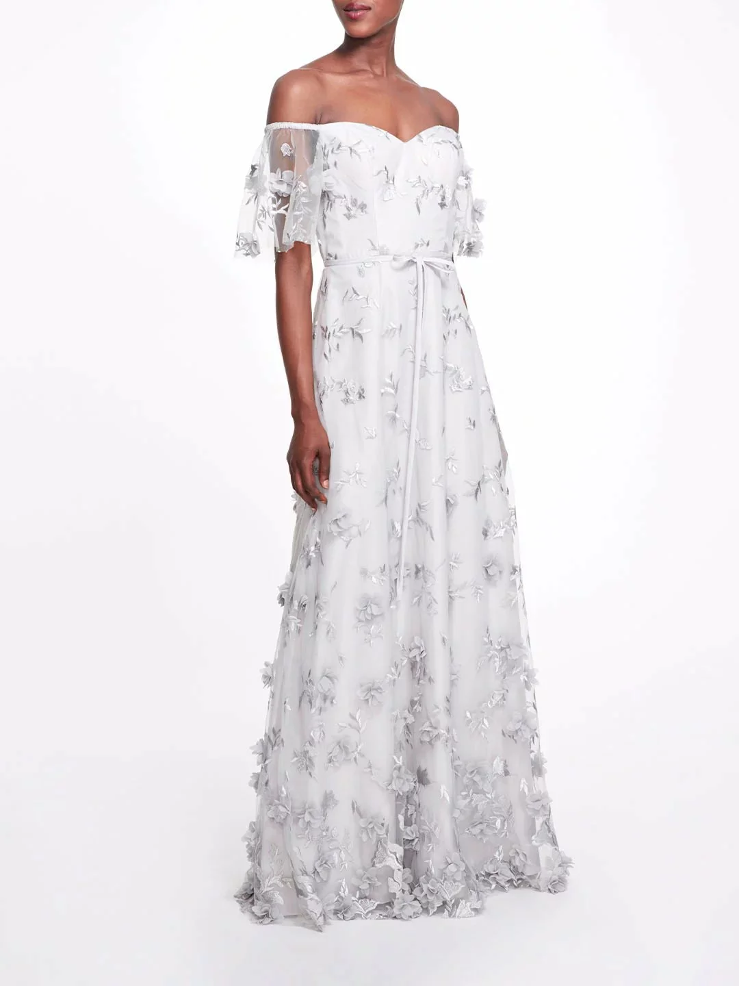 The Portici gown is a romantic option for any occasion. Featuring an off the shoulder sleeve, amorous 3D flower appliqués, and a stunning ribbon at the waist.