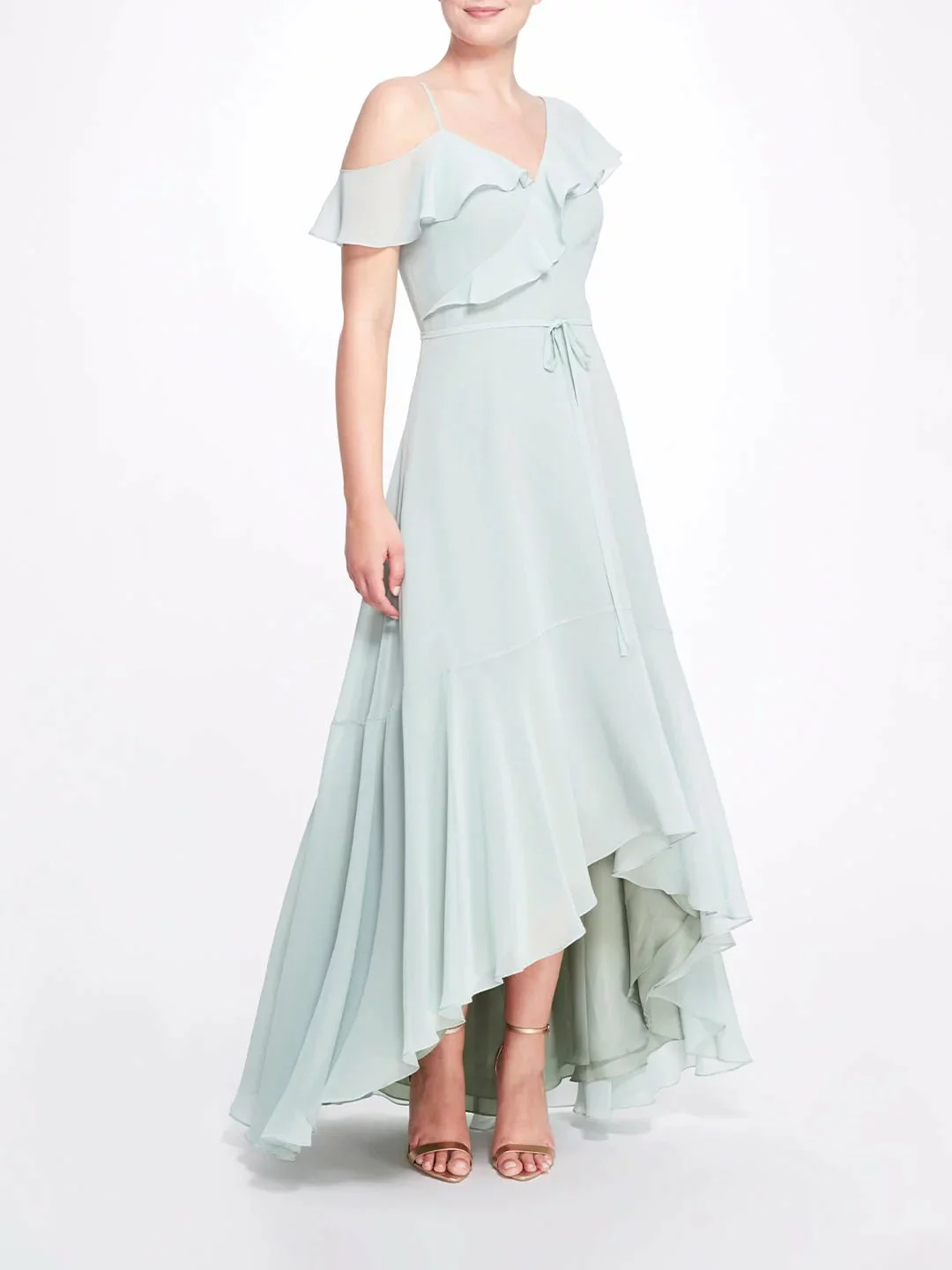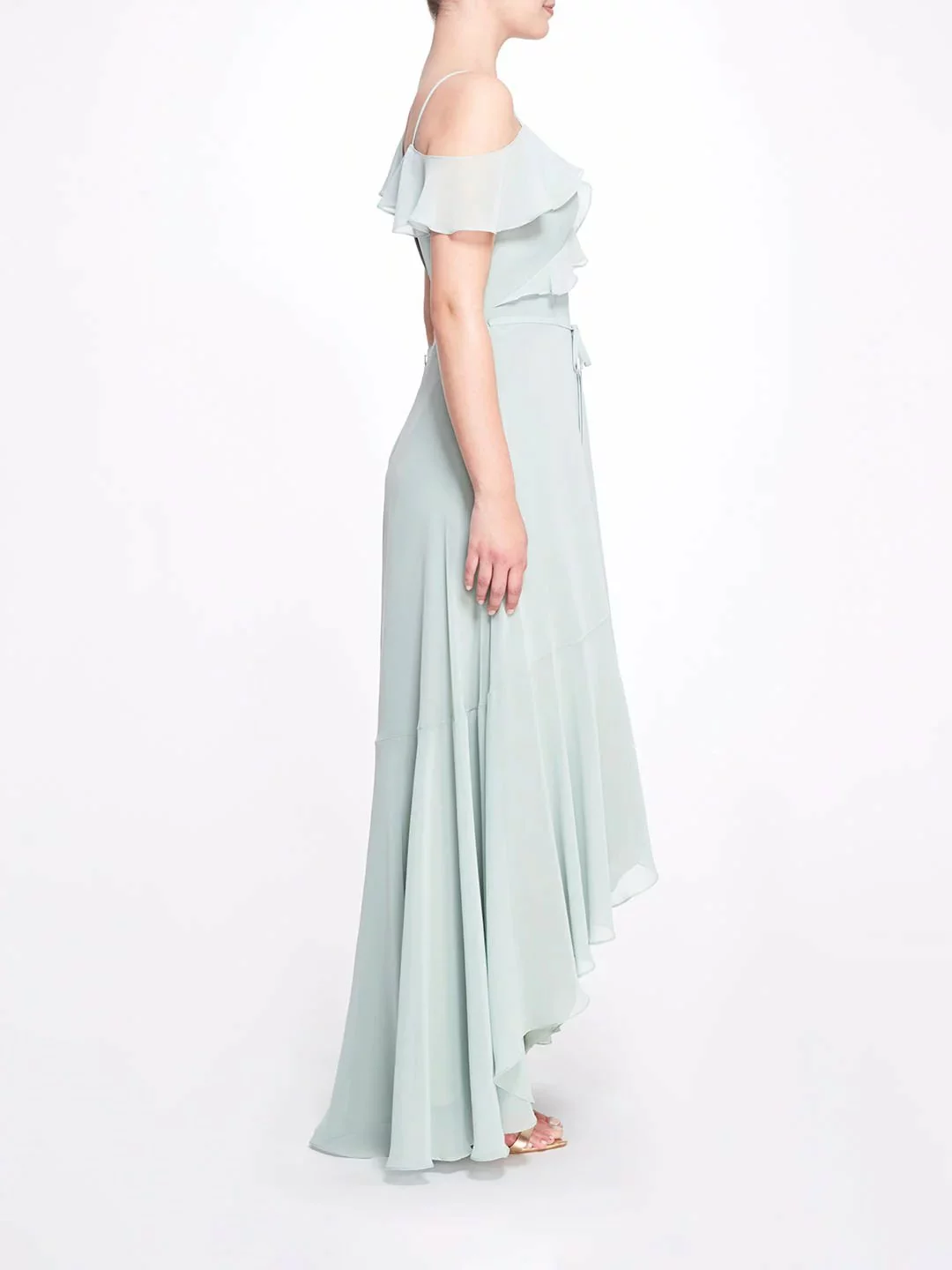The Reggio is a delicate gown, featuring a one-shoulder neckline with ruffle sleeve, long bodice, hi-low skirt, and dainty tie waist.