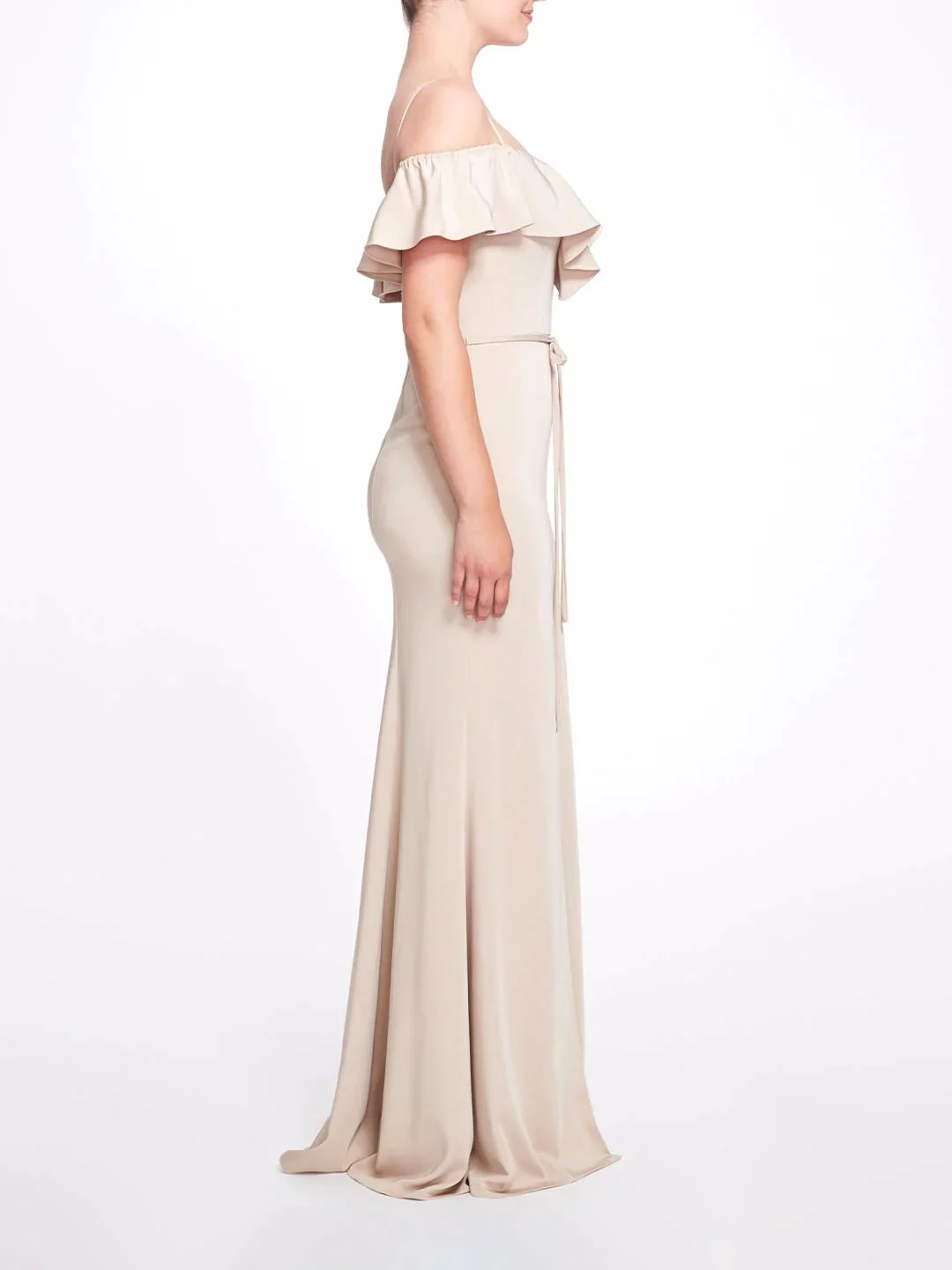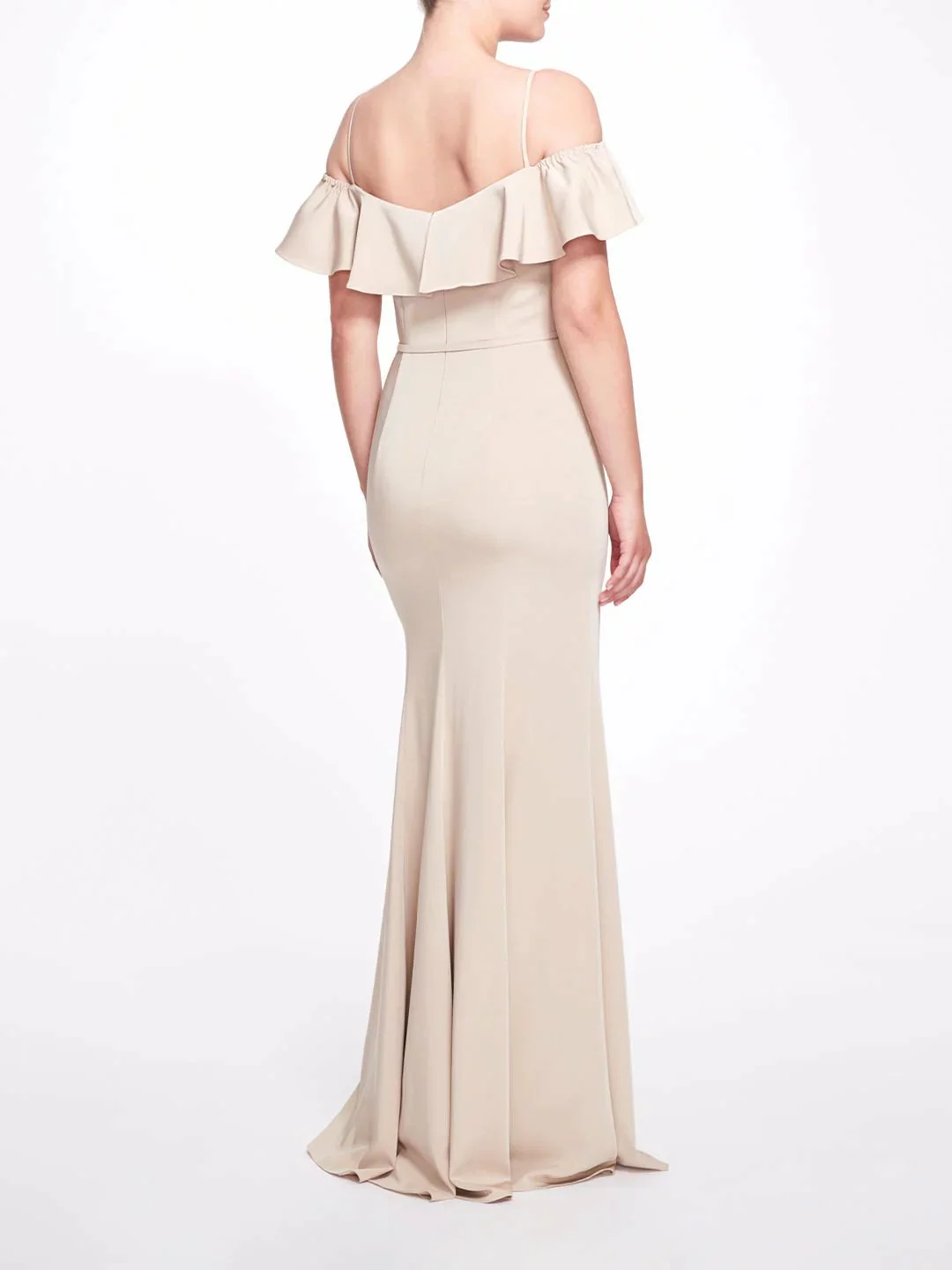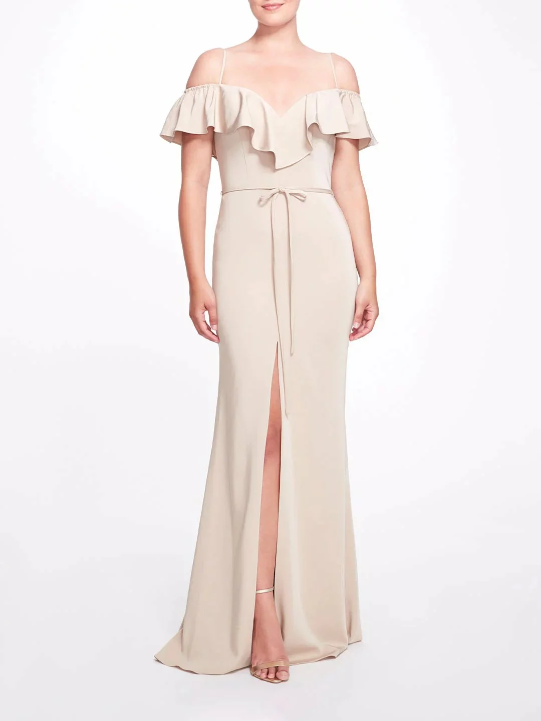 The Rivoli gown features cami straps, a shoulder ruffle, and frontal leg slit.
