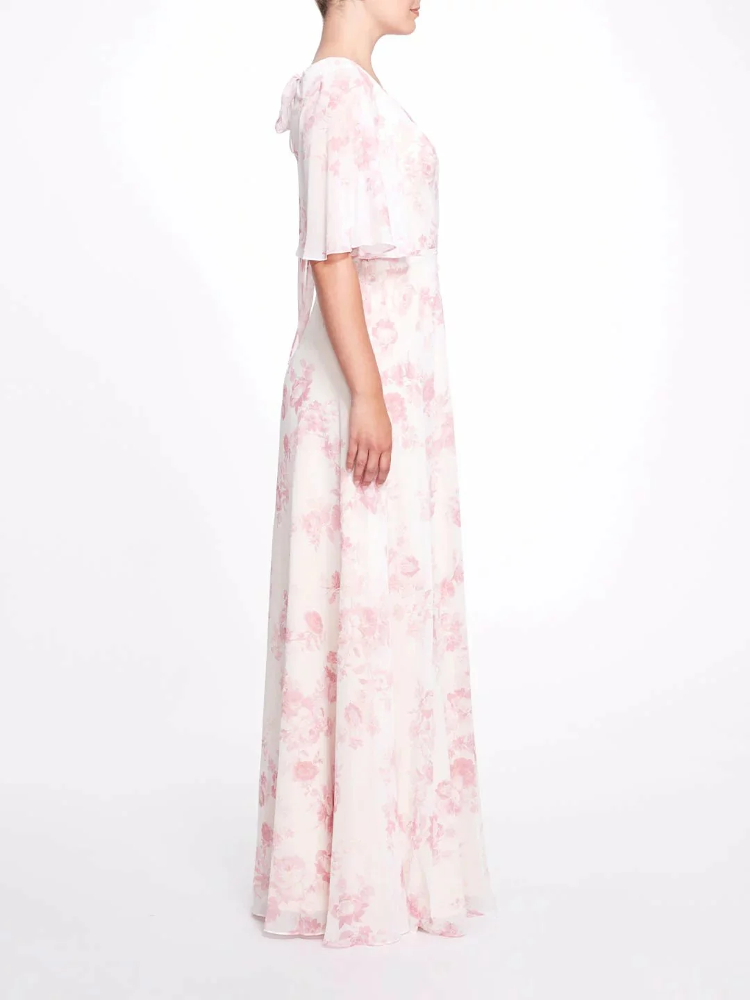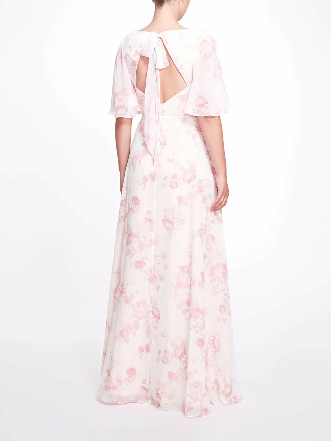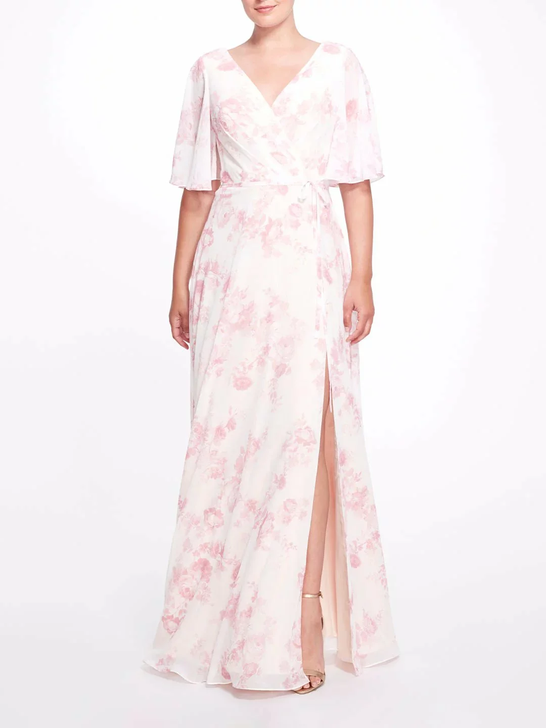 All eyes will be on you at your next event in the Rome gown. Featuring dreamy short flutter sleeves, a charming wrap neckline, an enticing open back with an enchanting bow, and a delightful leg slit.