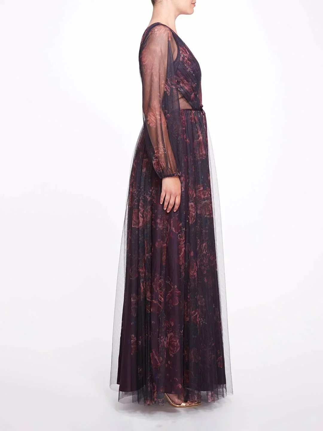 Become the epitome of femininity in the Salerno Printed Gown. Featuring tulle fabric, a bewitching back opening, and ethereal sheer sleeves and side panels.