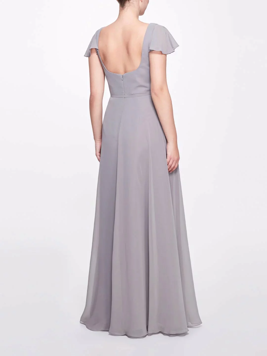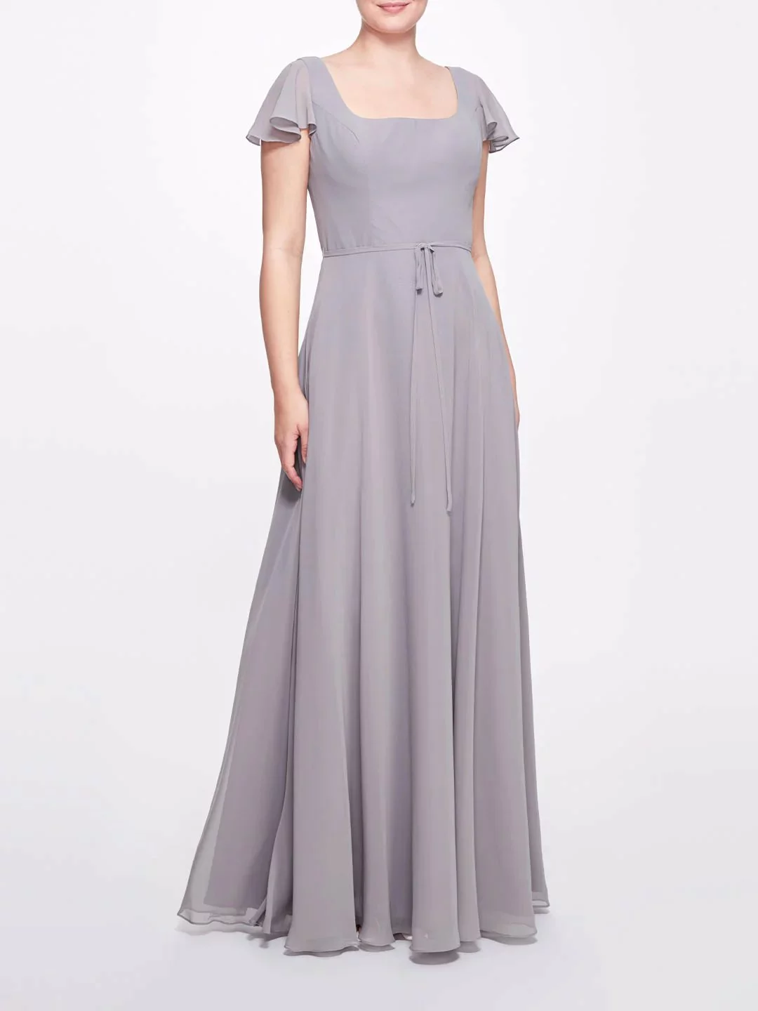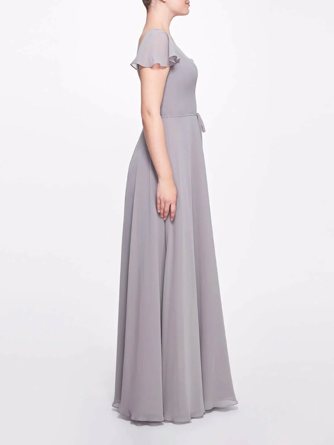 Featuring a ruffle sleeve, this gown is encompassed with a U-neckline.