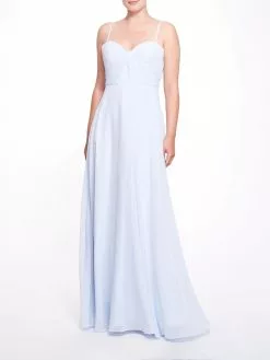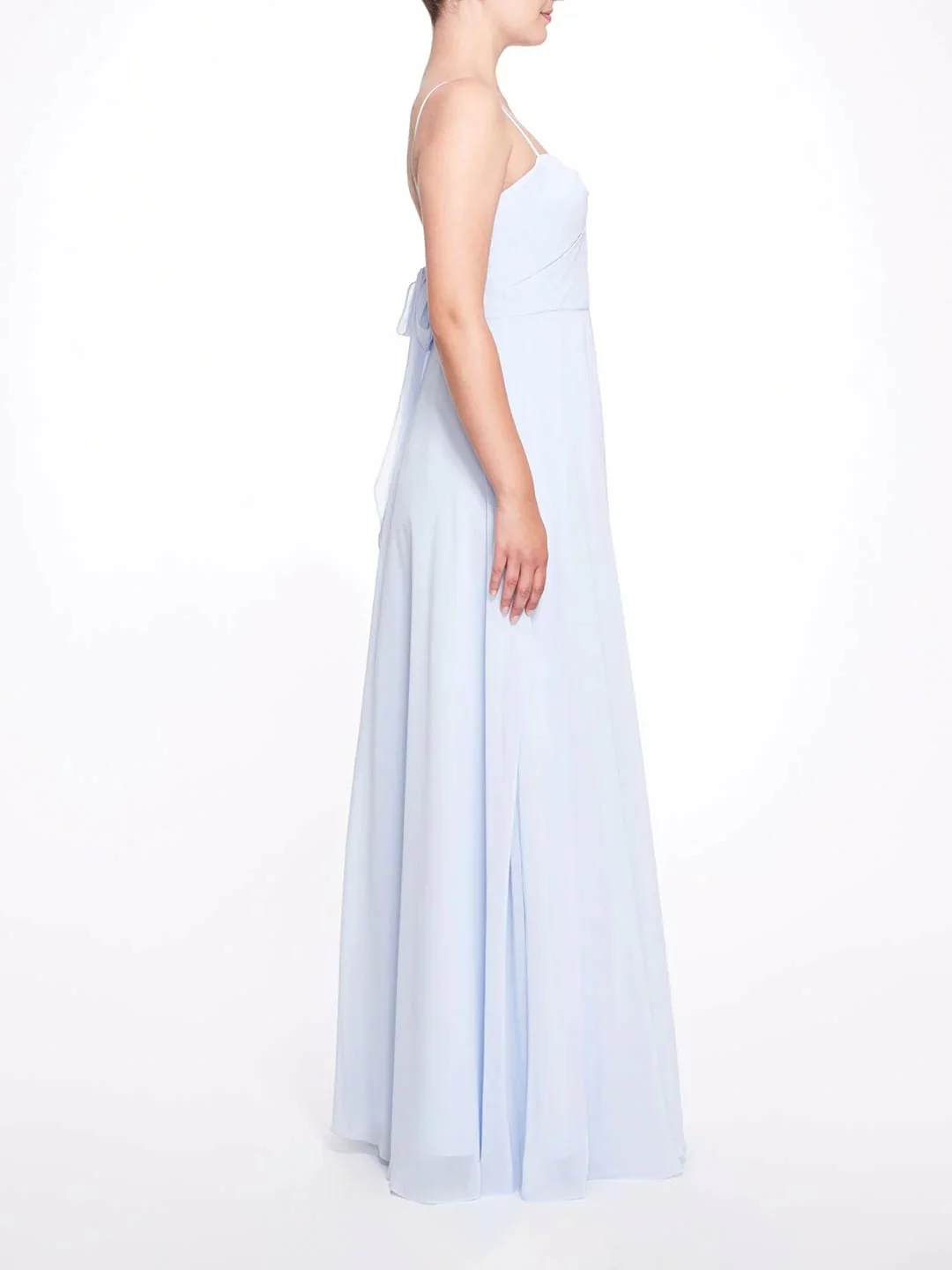 The Verona Gown features draped tulle and a back tie ribbon detail.