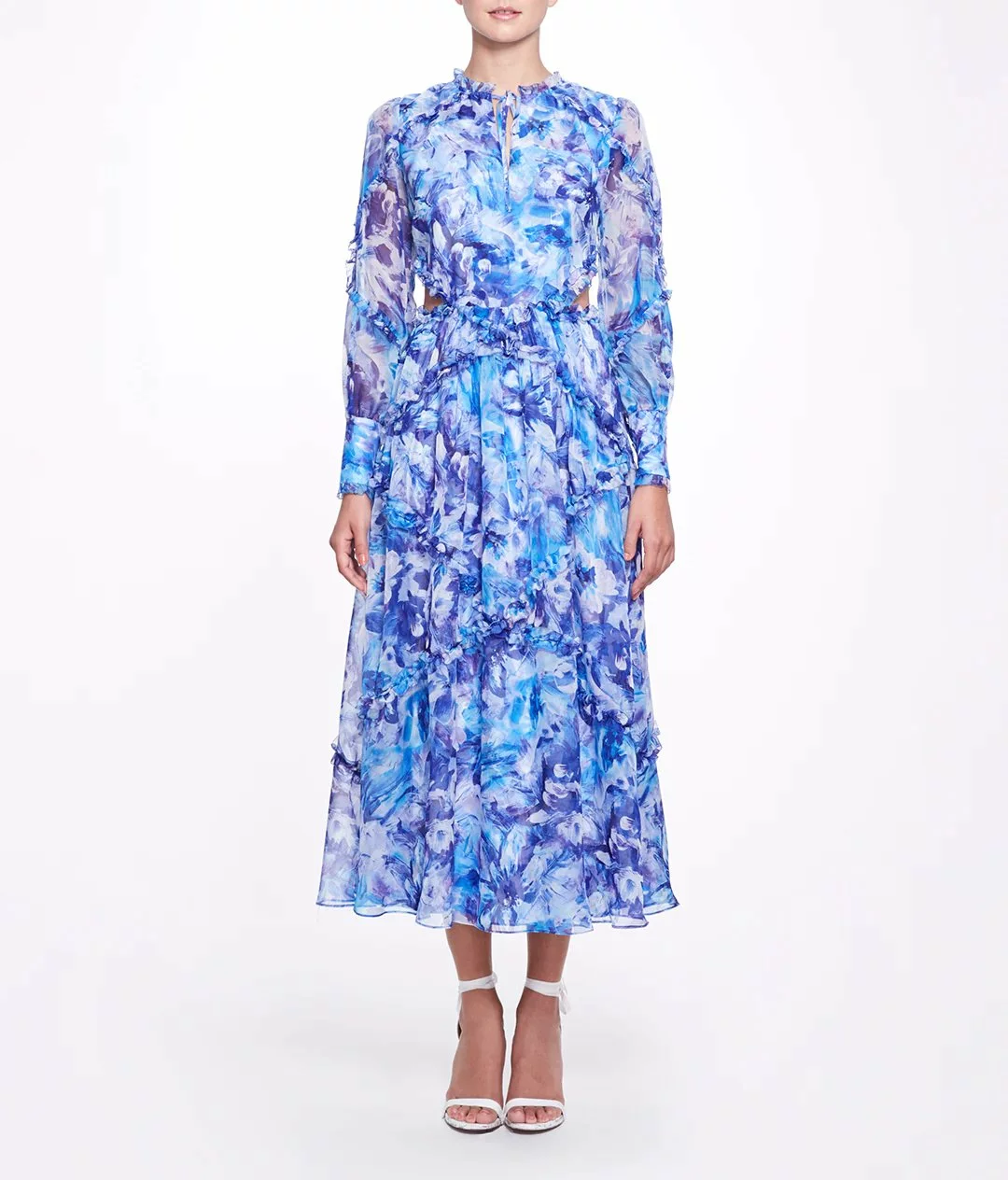 Abstract floral printed chiffon long sleeve A-line midi dress with waist cutout, full bishop cuffed sleeve, interlacing ruffle detail and center front keyhole with tieModel is 5’9″ wearing a size 6.