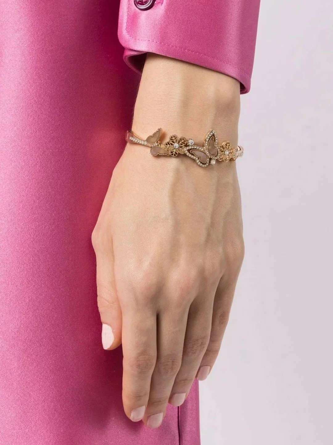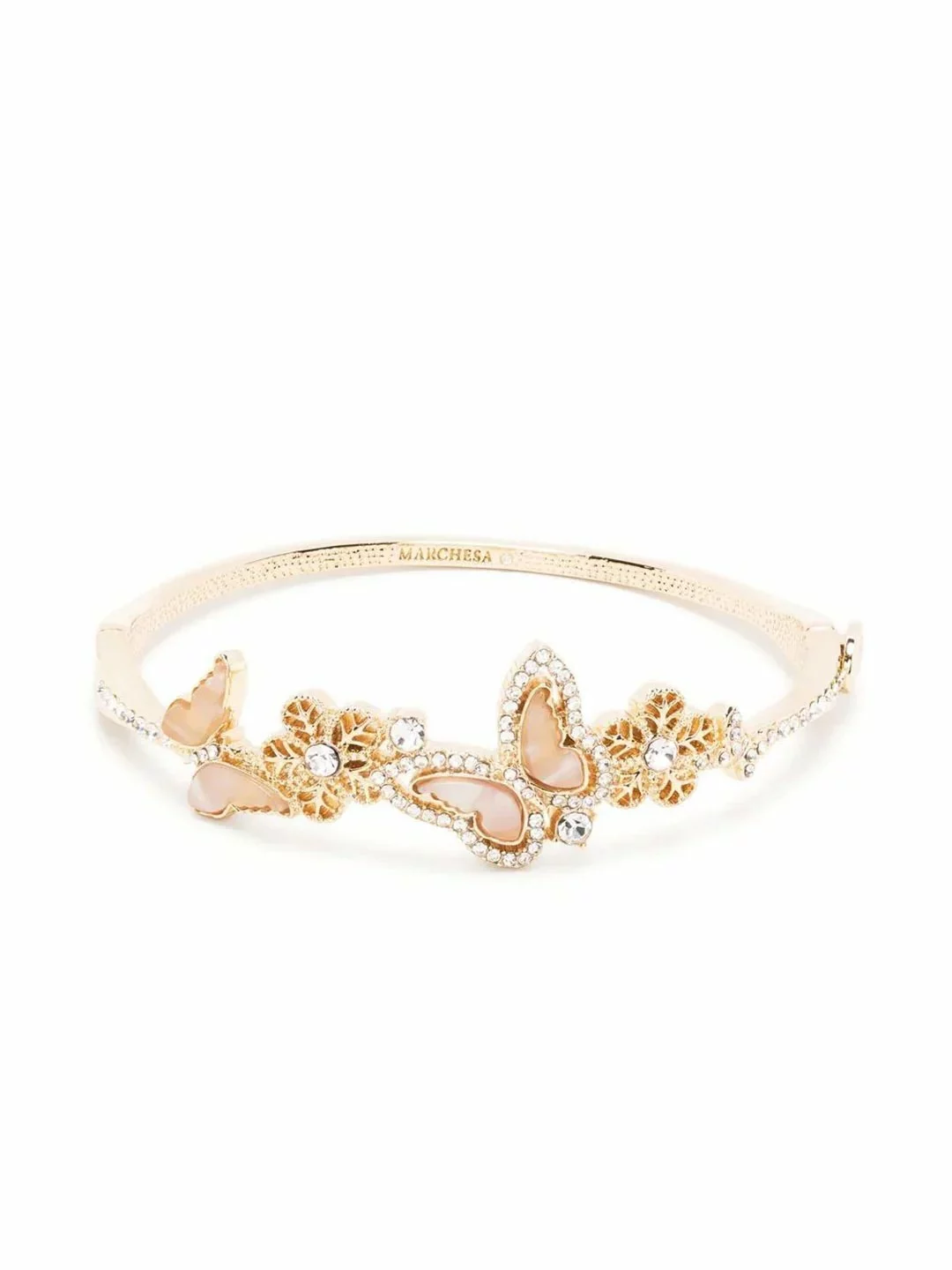 The Blush Butterfly Bangle alternates between blush marbled stone butterflies outlined in crystals and gold-plated five petal flowers with a crystal at the center. The dainty brass bracelet is featured in a gold tone with gold hardware.