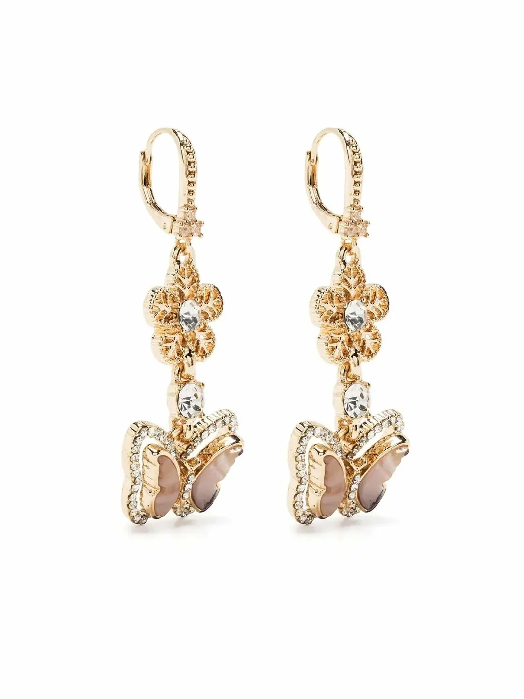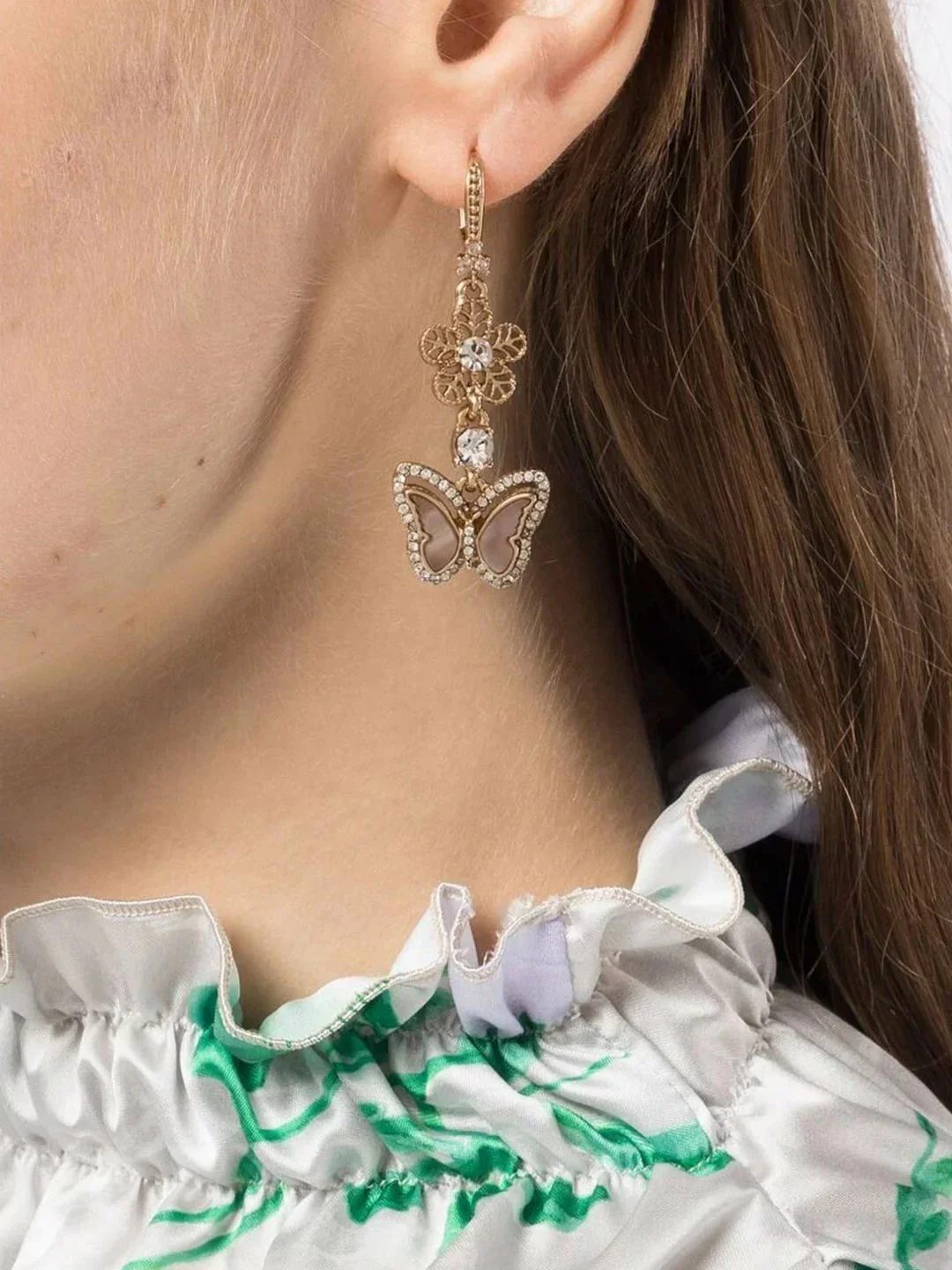 The Blush Butterfly Drop Earring features a 5 petal gold plated flower with a translucent crystal at the center, followed by a blush marbled stone butterfly outlined in crystal. The dainty earrings are gold plated with a gold tone.