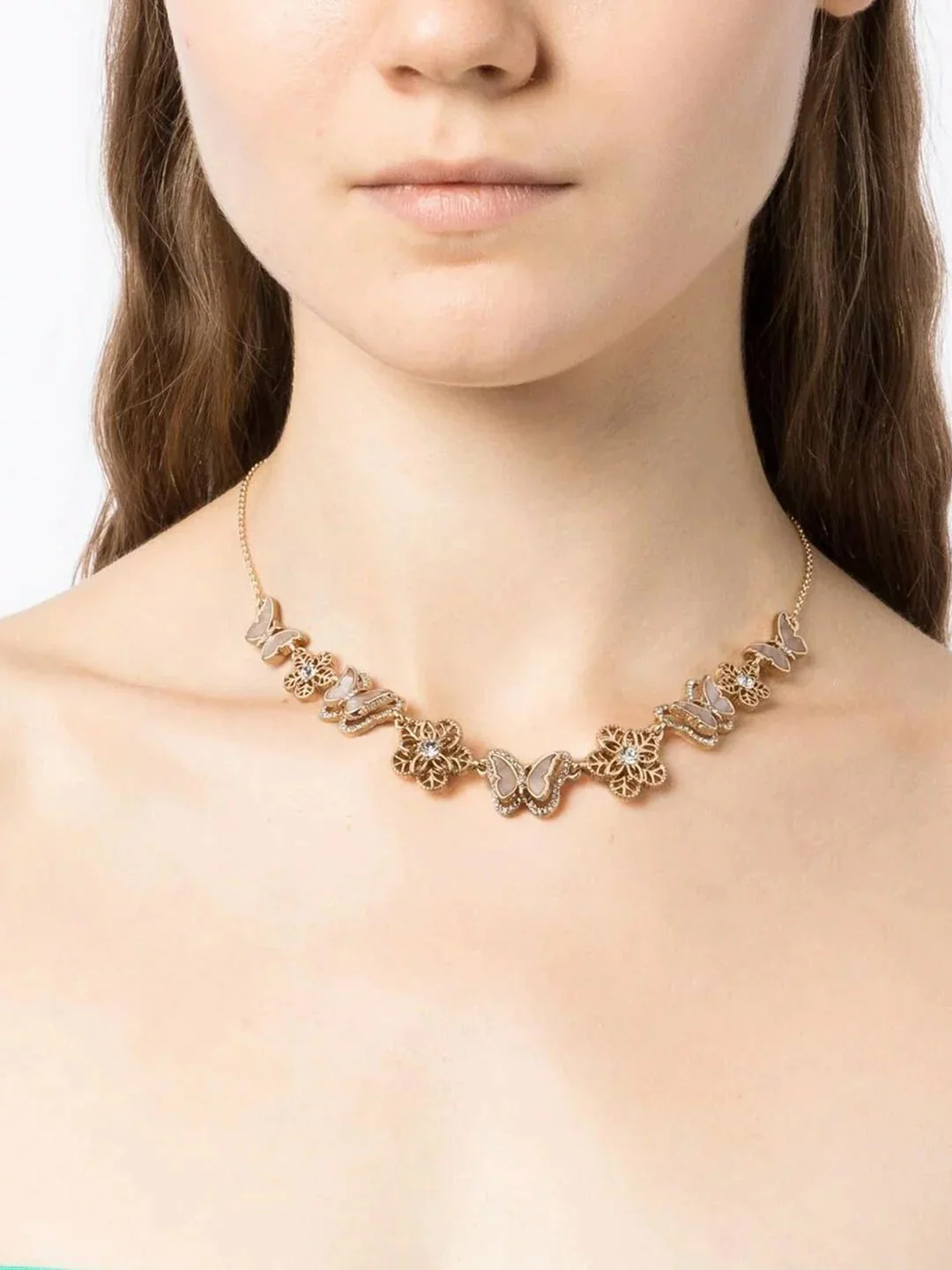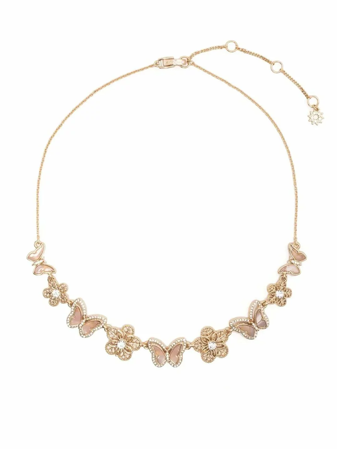 The Blush Flutter Necklace alternates between steel blush marbled stone butterflies outlined in crystals and gold-plated five petal flowers with a faux pearl at the center. The dainty brass necklace is featured in a gold tone with gold hardware and measures 16 inches in length with four length options.