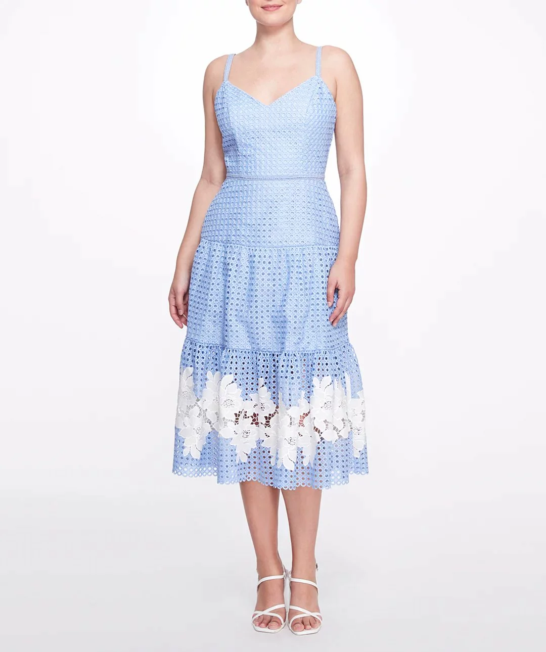 The embodiment of delightful daywear, The Guipure Midi Dress in dusty blue features a tiered a-line silhouette, sweetheart neckline, and bold white floral border detailing to create a stunning contrast. Gorgeous in guipure, it’s the quintessential addition to any chic wardrobe.