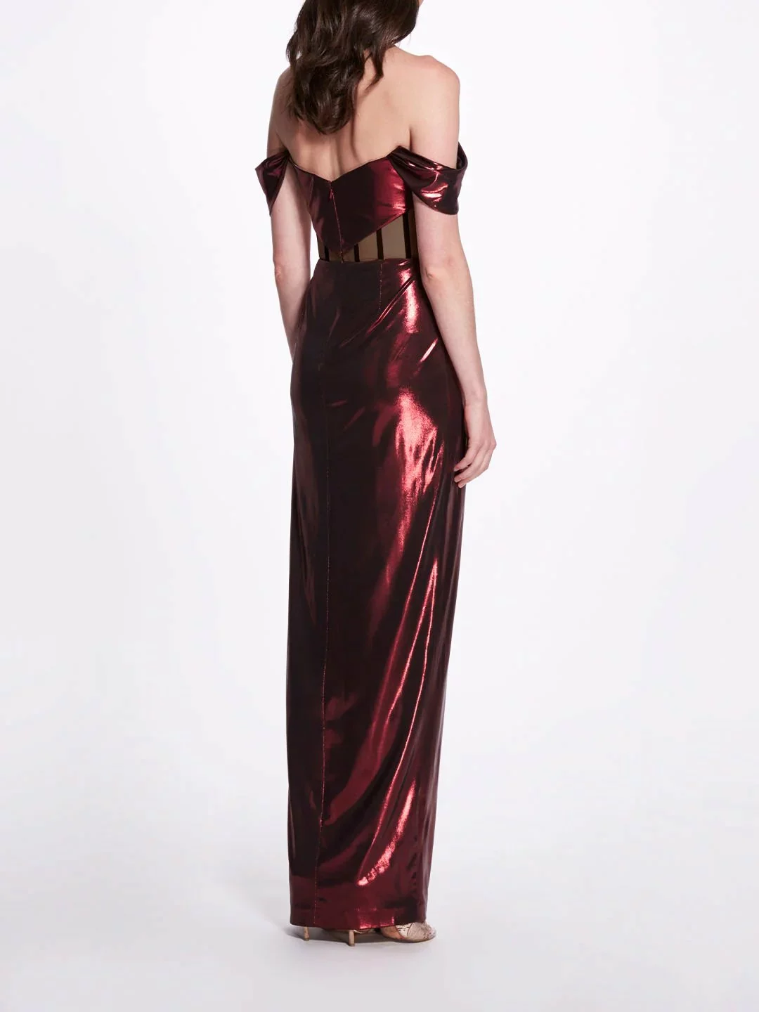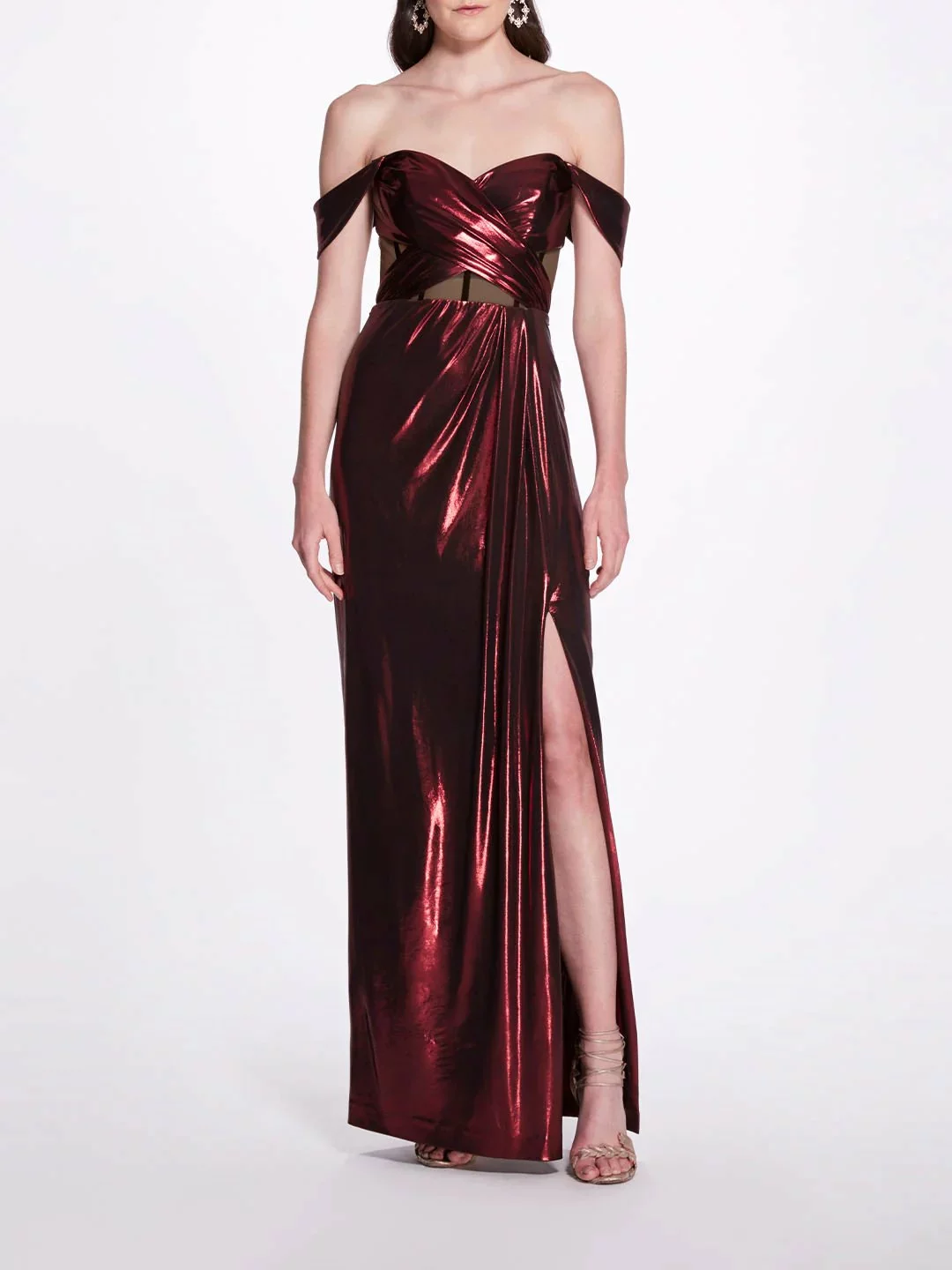 The charm of glamour, this floor-length gown in red features an off-the-shoulder sweetheart neckline, pleated lamé, a knee-high slit, and crisscross details going around the cut-out bodice.