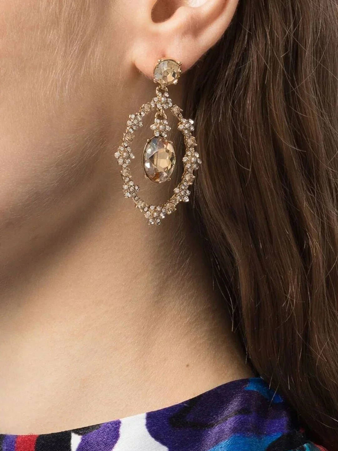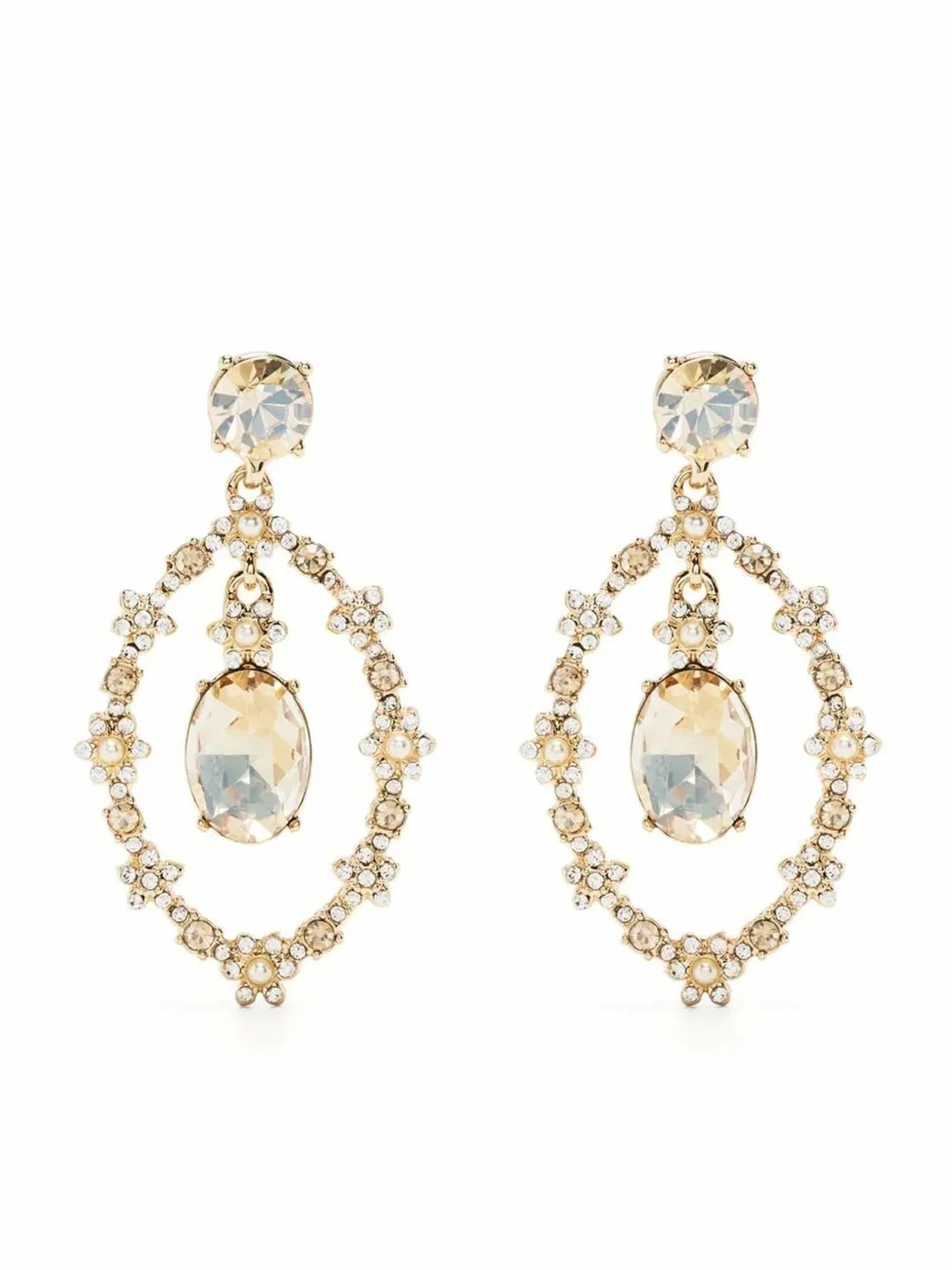 The Open Orbital Gold Earring is a drop earring featuring alternating crystals and faux pearls framing a drop stone at the center. The dainty earrings are gold plated with a gold tone and gold hardware.