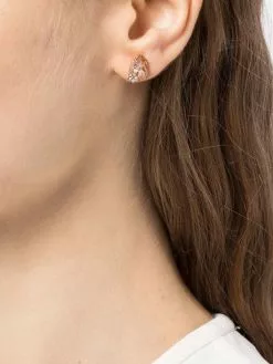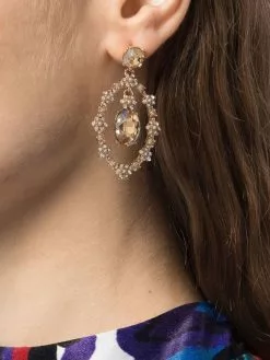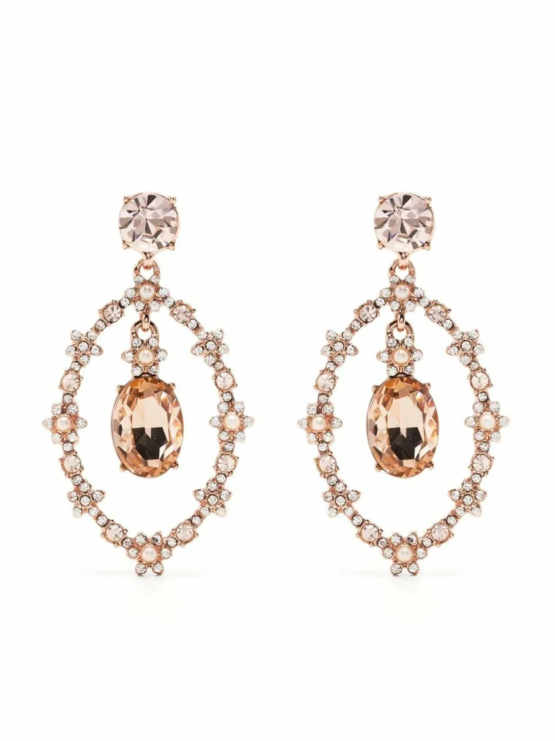 The Open Orbital Rose Gold Earring is a drop earring featuring alternating crystals and faux pearls framing a blush drop stone at the center. The dainty earrings are gold plated with a rose gold tone and rose gold hardware.