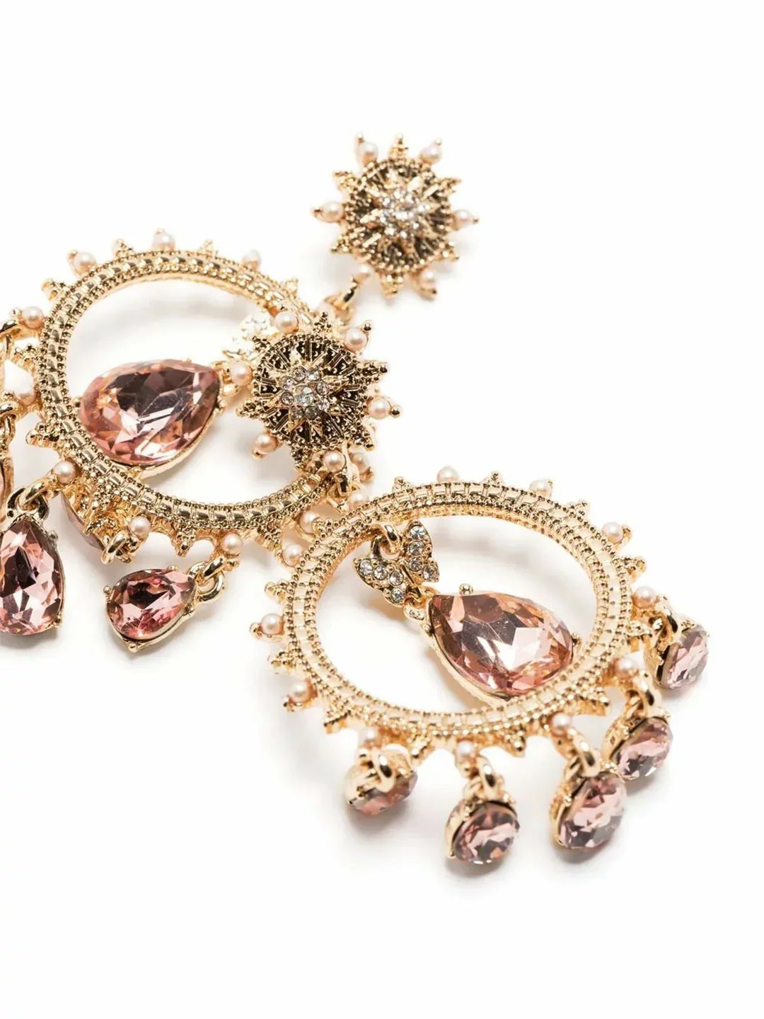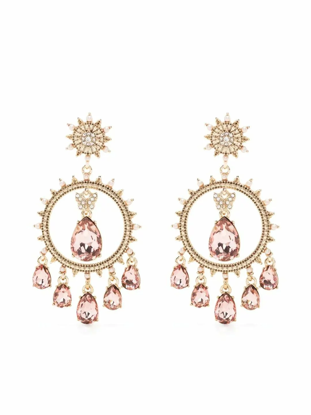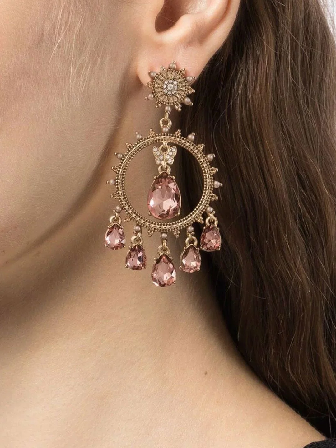 TheĀ Pink Orbital Chandelier Earring is a drop earring featuring a crystal-embellished starburst hoop elongated with tieredĀ pink teardrop stones. At the center sits a petite crystal butterfly and statementĀ pink stone. A 12-point starĀ lies at the base. The dainty earrings are gold plated with a gold tone and gold hardware.