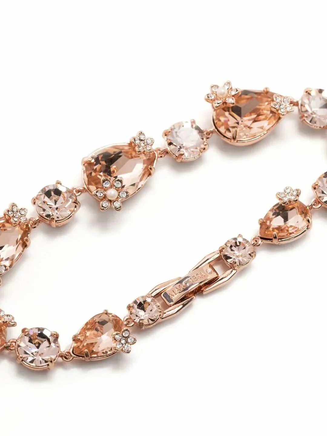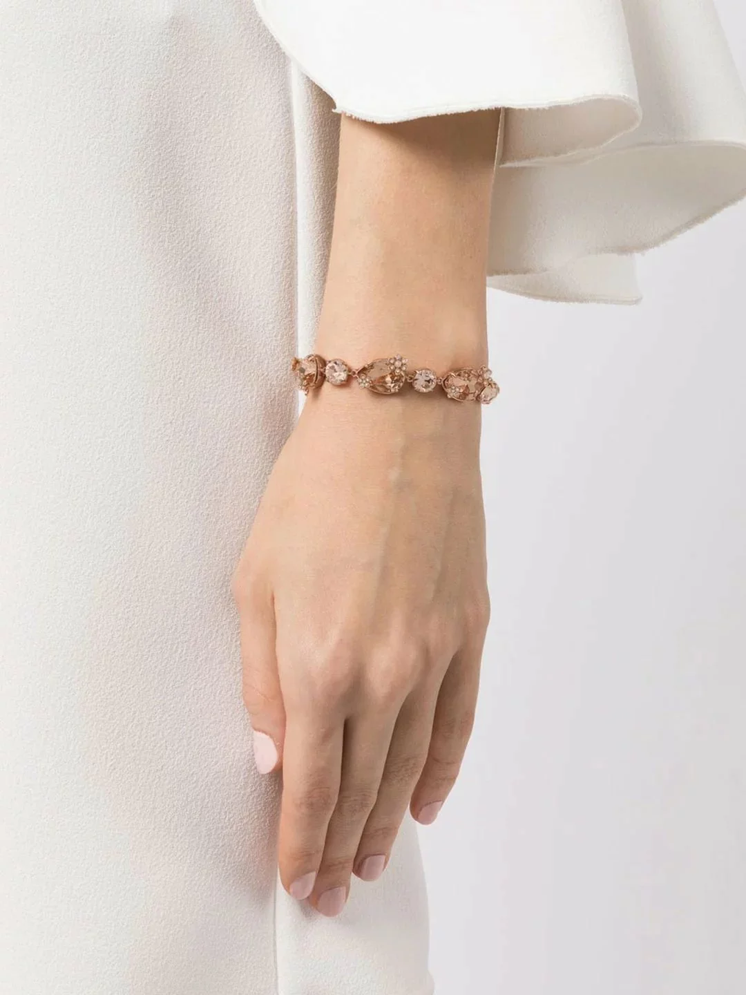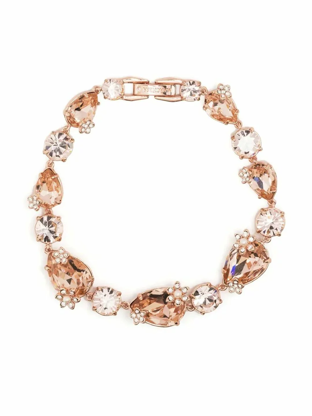 The Rose Gold Pear Bracelet alternates between golden pear-shaped crystals and round translucent crystals, strung together by gold hardware. The dainty bracelet is gold plated with a gold tone.