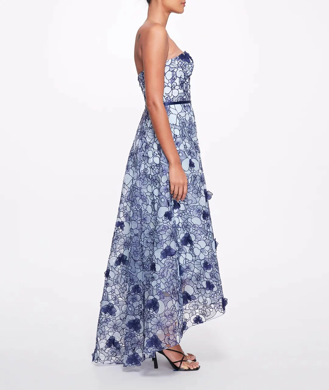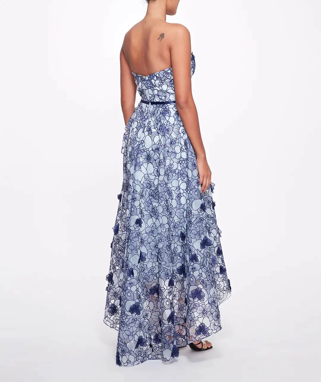 Utterly charming, the Strapless Organza Gown in blue features an a-line high-low silhouette, strapless sweetheart neckline, and embroidered cut-outs with 3D appliqués. Flowing in floral embroidered organza, it’s the quintessential addition to any chic wardrobe.