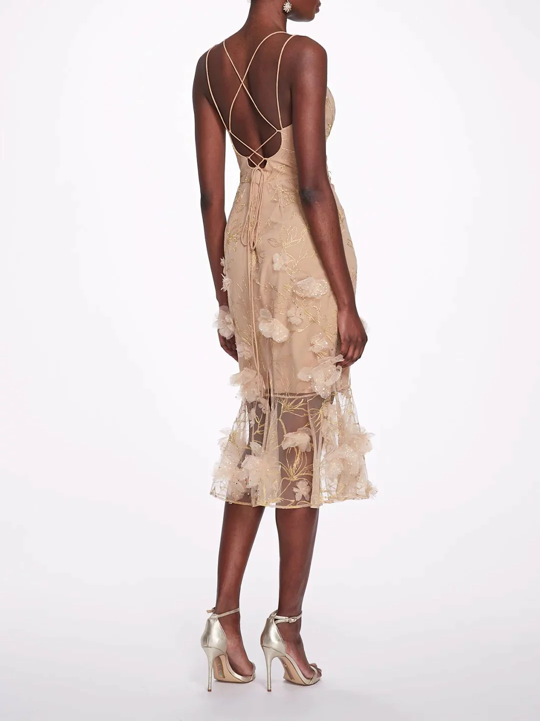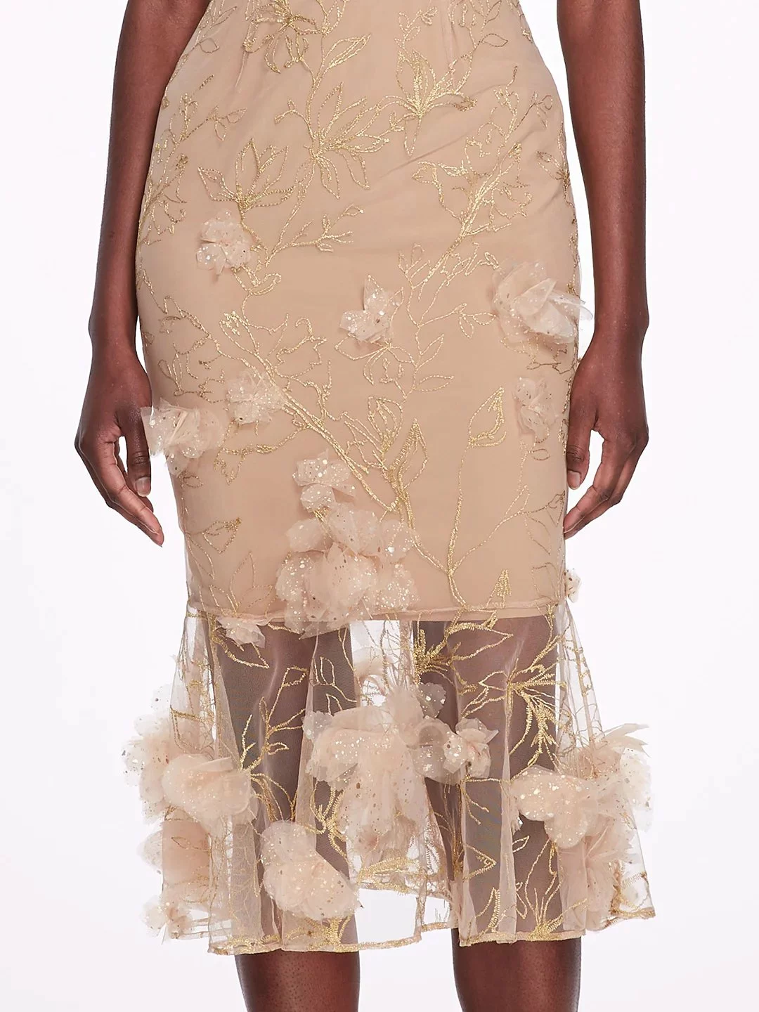 The personification of elegance, this midi-length gown in nude features a strappy sleeveless v-neckline, gold and glitter tulle, and a side illusion cut-out detail on the side bodice.