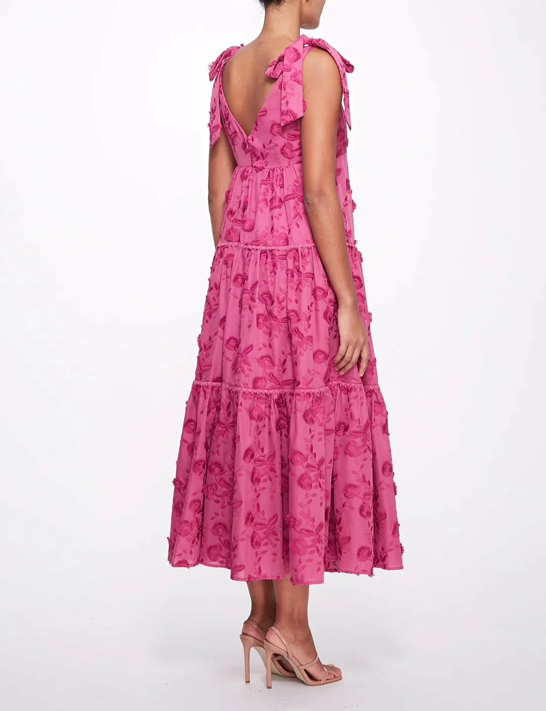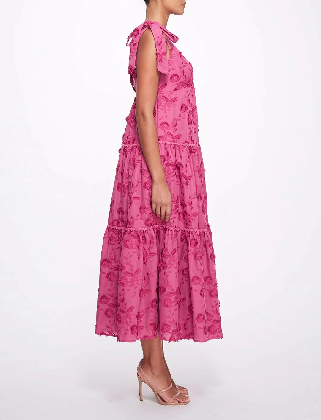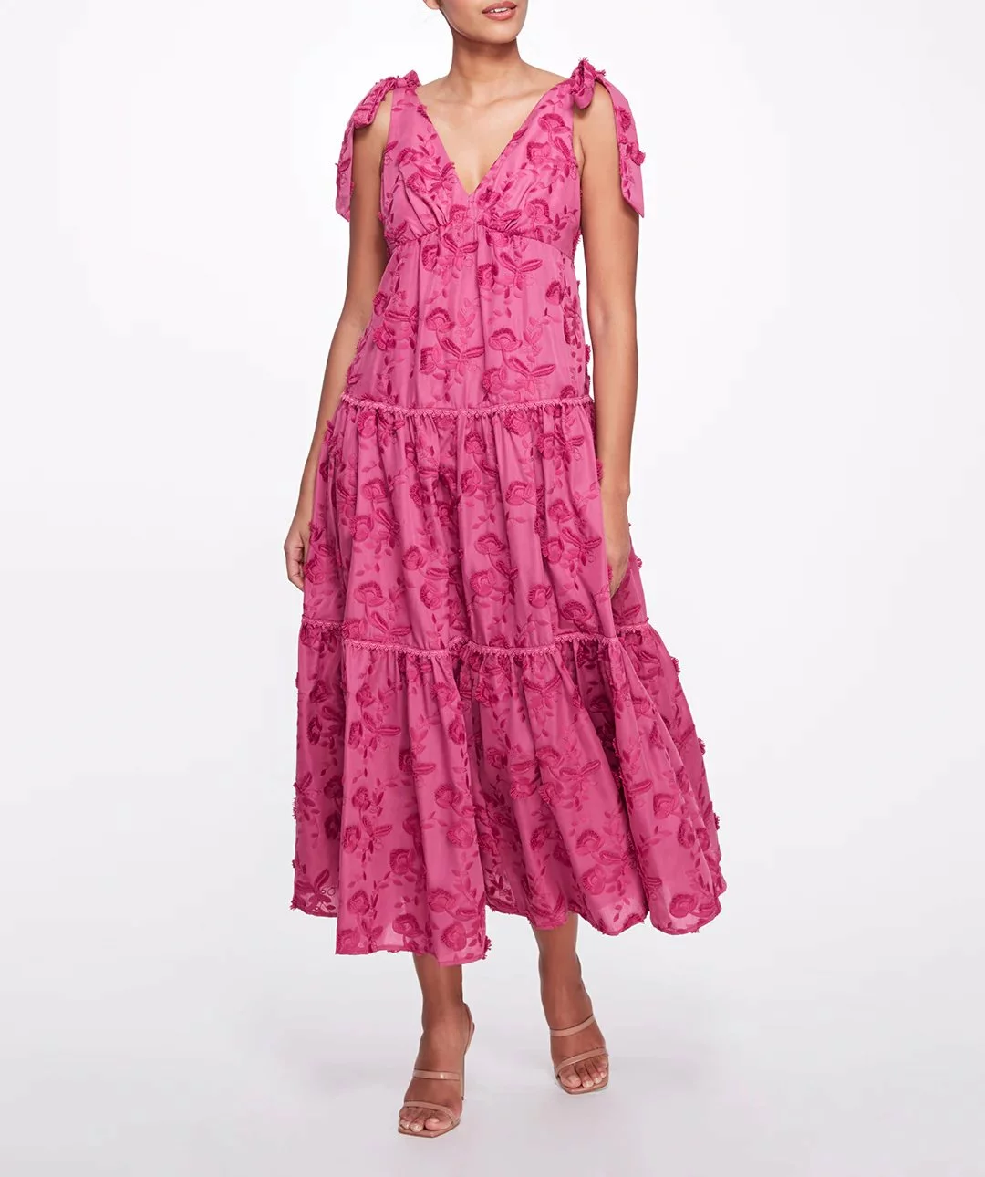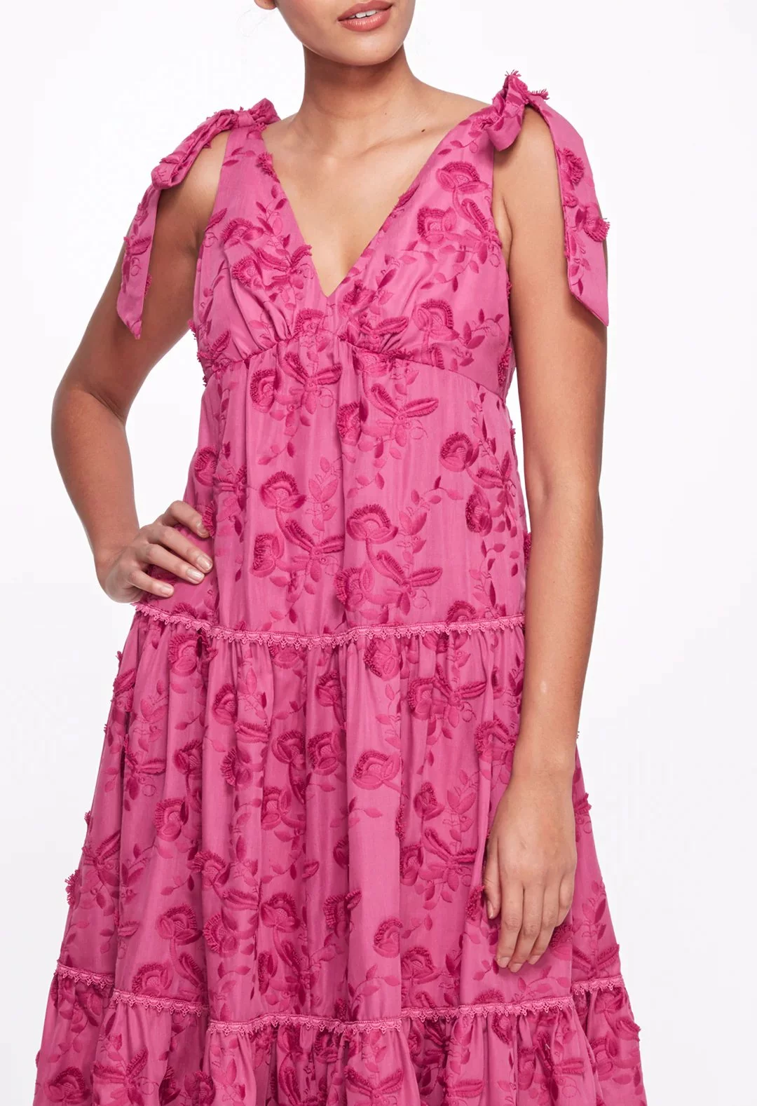 Fun and fresh, the sleeveless Tie Strap Maxi Dress in pink features an empire waist tiered silhouette, v-neckline, and 3D tulips to create a charmingly elongated figure. Perfect in pink cotton, this maxi dress is an essential addition to any chic wardrobe.