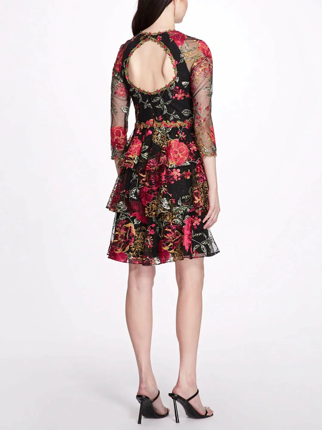 A rose in a garden, this two tiered cocktail dress in black features an A-line silhouette, a boat neckline, long netted sleeves and beautifully embroidered florals. Intriguing in black, this dress is a stunning classic to add to your wardrobe.
