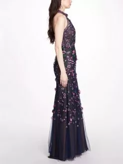 Marchesa Notte 3D Floral Appliqué Halter Gown