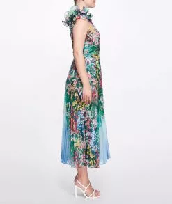 Marchesa Notte Pleated Chiffon Tea-Length Gown