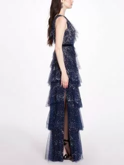 Marchesa Notte One-Shoulder Tiered Gown – Navy